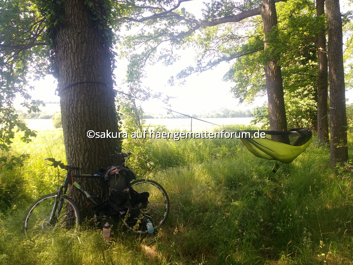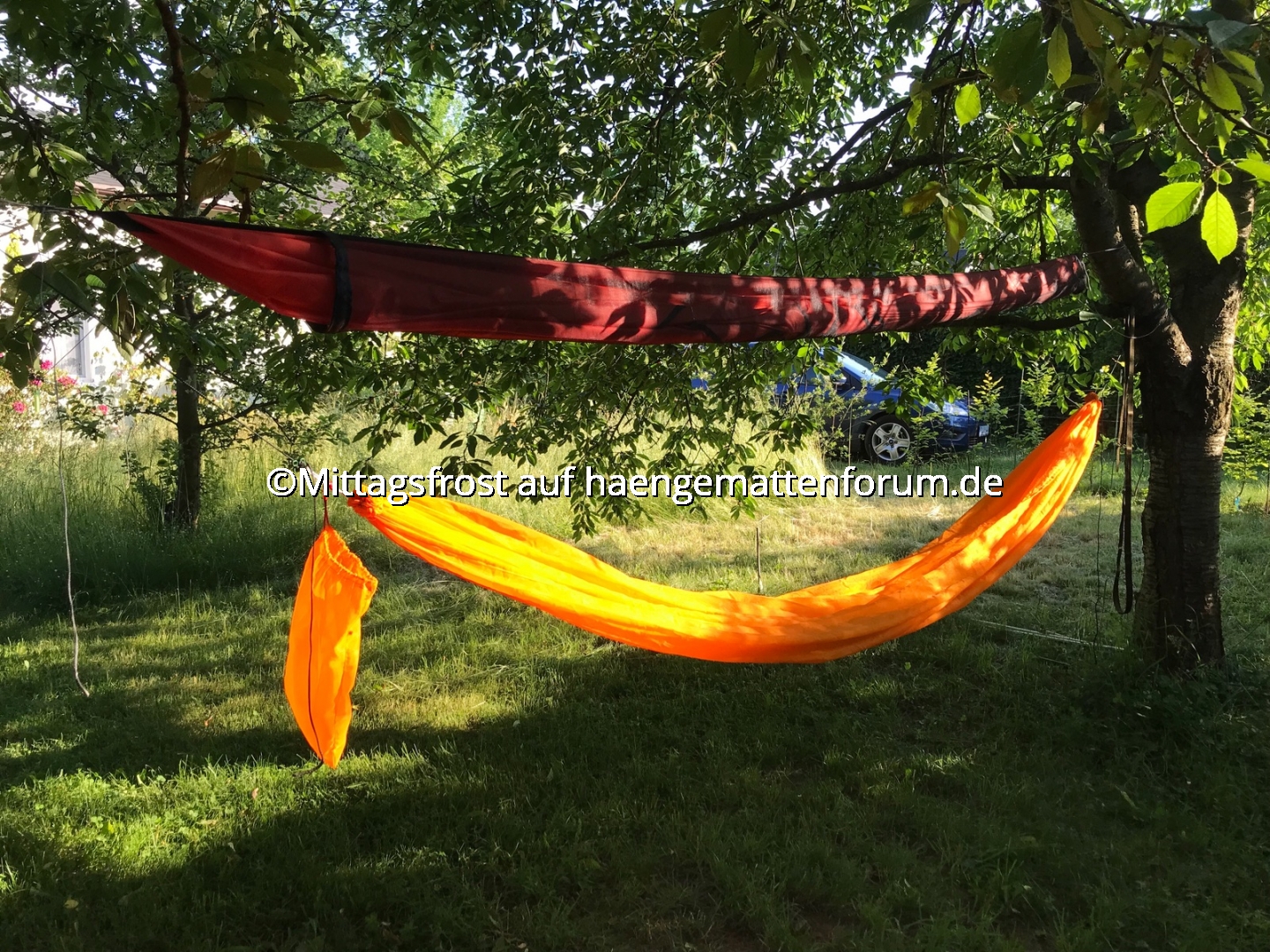 Genau. Ich hänge zwischen zwei Kirschbäumen, links neben dem Packbeutel steht ein Apfelbaum. Was glaubst Du, was hier zur Erntezeit los ist! Wütend schimpfen die Stare, ich würde sie beim Mittagessen stören. Dabei liege ich doch friedlich in der Hängematte. Wenn sie mich mit Kirschkernspucken und Vogelkacke zu vertreiben versuchen, muss ich dann zum Schutz das Tarp aufspannen.