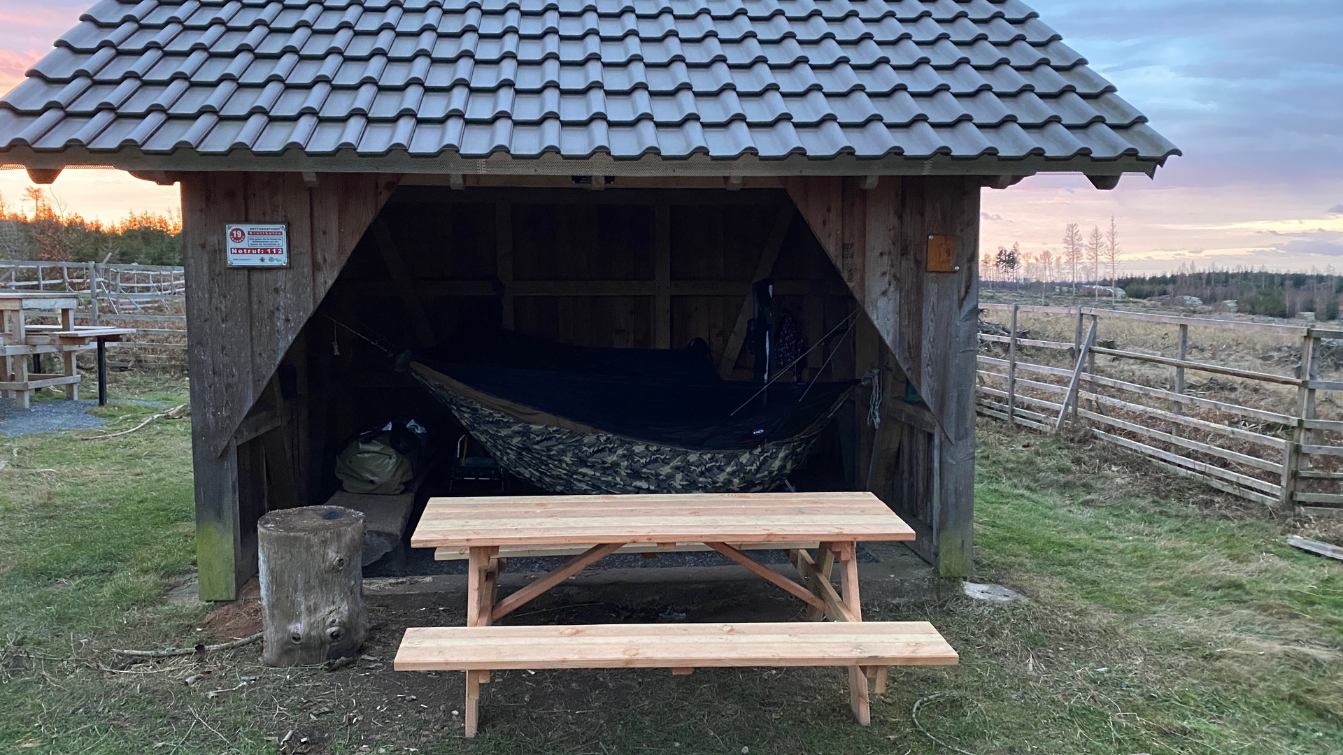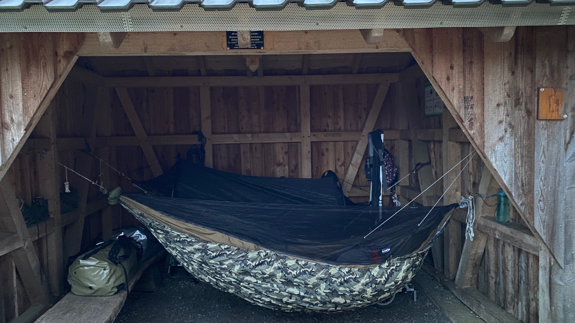 Wo es partout keine sicheren Bäume zum hängen gab musste halt eine Hütte her halten.