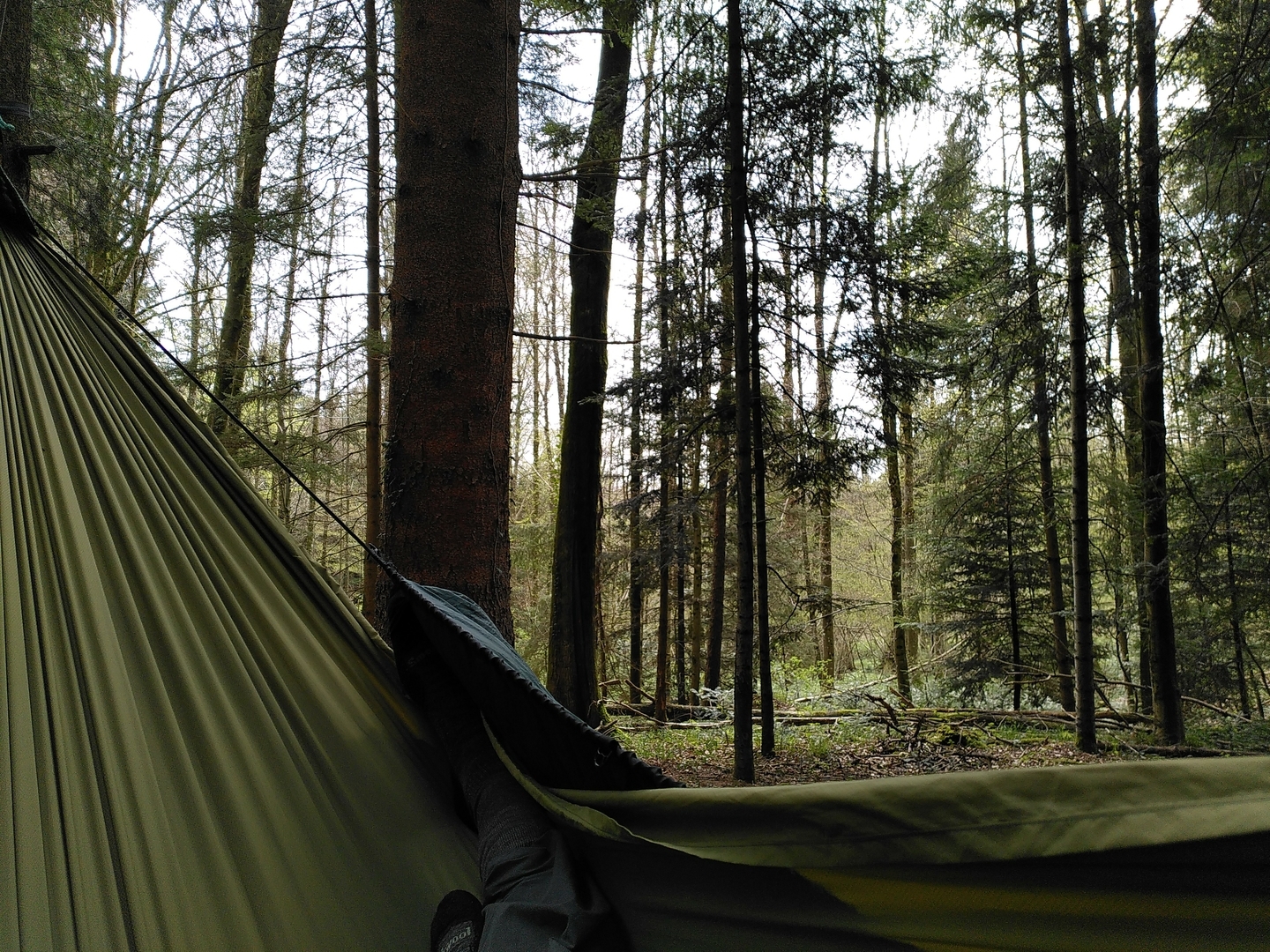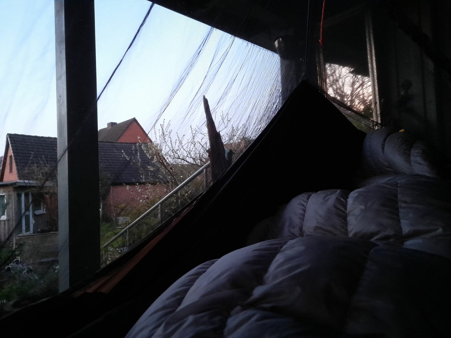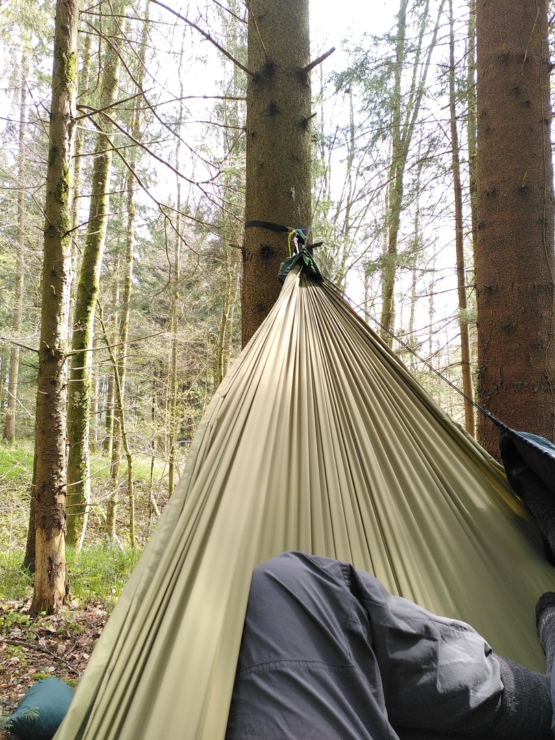 heute mal die grosse Decathlon zwischen meine Gartenbäume gehängt.