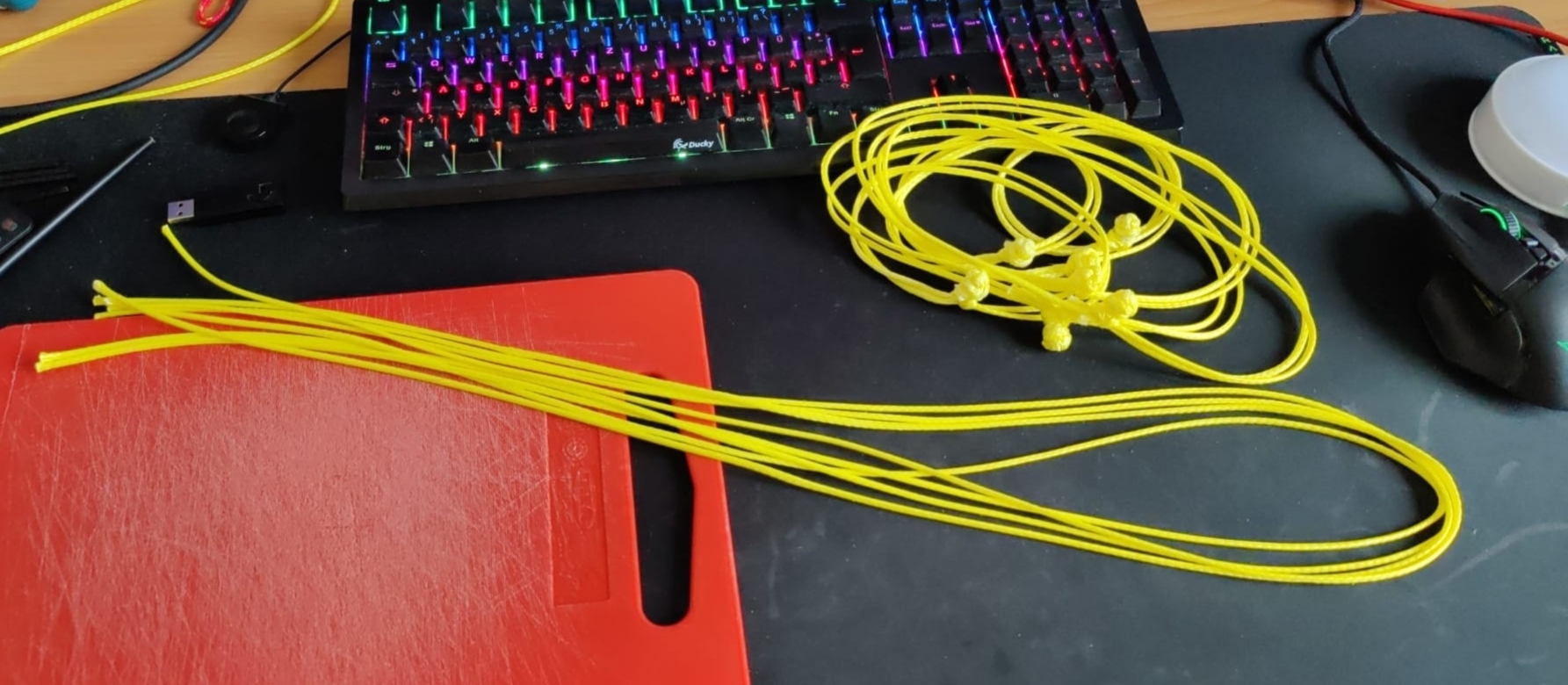 Ich hab ein paar Soft Shackles geknüpft, da ich zu geizig bin mir Karabiner zu kaufen.