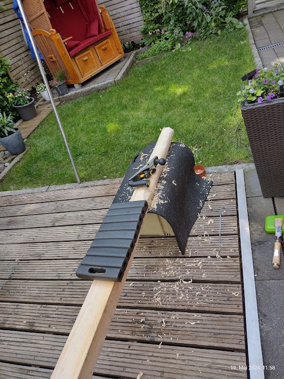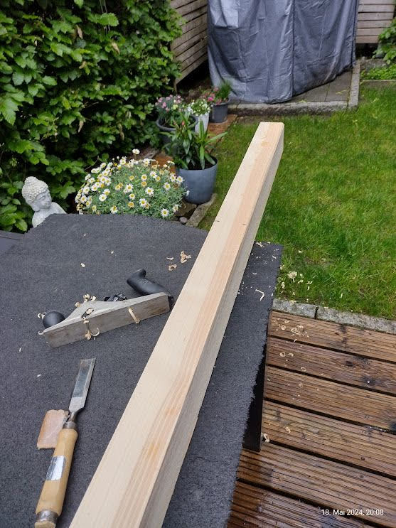 Mit einem Schaumstoffkissen konnte ich auf dem Balken Platz nehmen, mit knapp 89kg rutsch da nix mehr, der Hobel konnte ordentliche Späne (die wurden natürlich eingelagert als Zunder) hobeln. Fertig ist die "Kiste".
