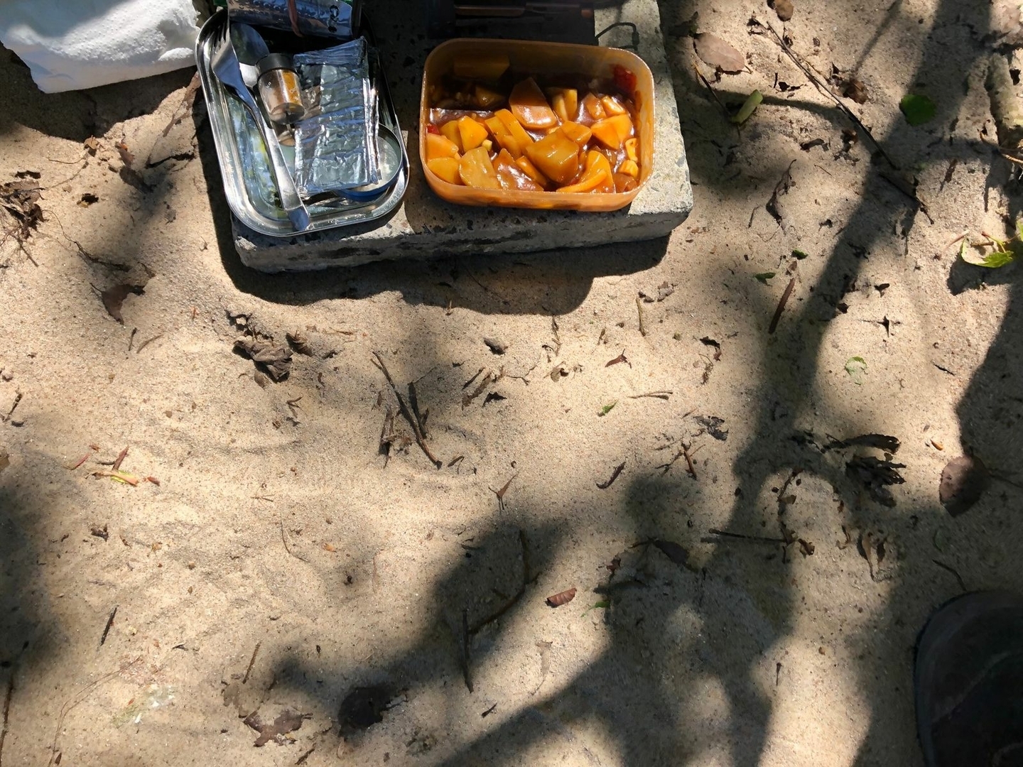 Da ich noch ein wenig Kartoffeln mit Gulasch von gestern übrig hatte, gab es den kleinen Snack für zwischendurch in einer Pause am Strand.
