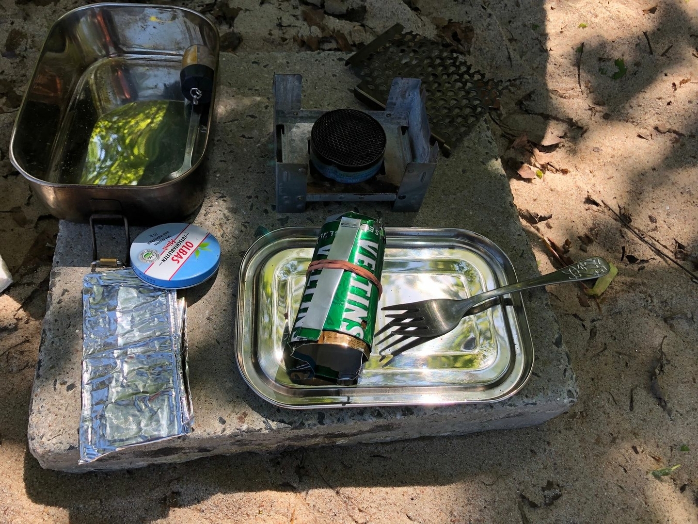 Gekocht bzw. aufgewärmt habe ich meine Mahlzeit auf meinem Esbit Klappkocher 😋 aus der zum Lounger Sessel aufgehängten DD Camping Hm mit einer Alu-Luftfolie zwischen den Lagen.