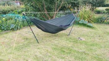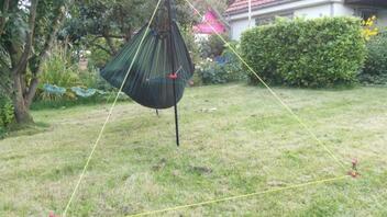 • Am zweiten Teil des Tages habe ich dann meinen neuen Handy Hammock Stand im Garten ausprobiert. Im Garten haben wir zwar Bäume aber die sind so platziert das man immer nur einen zum Abspannen nutzen kann.