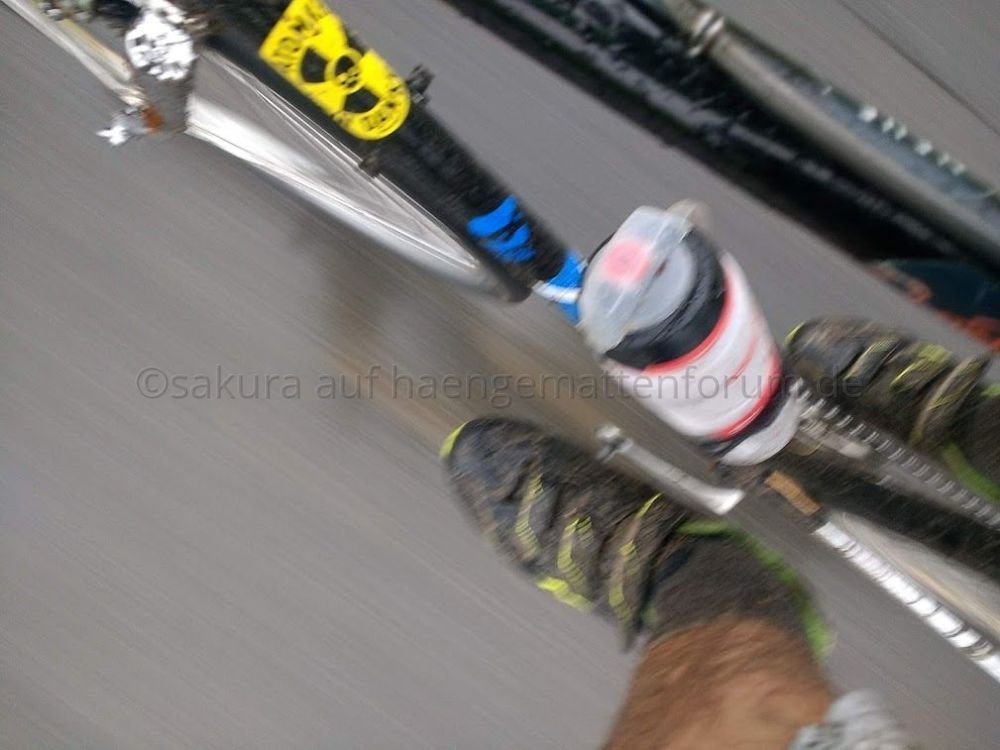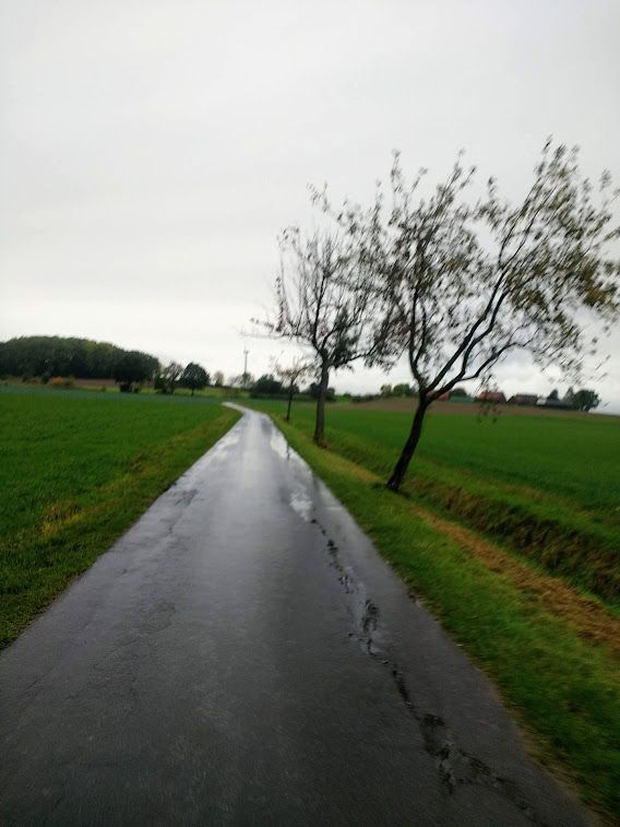 Leider klappte das nicht so ganz mit dem Wetter. Das von als auch von diversen Wetterdiensten prophezeite regenfreie Zeitfenster sagte isch wohl -Pustkuchen. Da ich auf dem Hinweg aber außer den ersten Kilometern meist Rückenwind hatte und ich die Regenjacke bereits an, hielt sich der Schaden in Grenzen. Eine leichte Feuchtigkeit auf der Bikehose, ging noch.