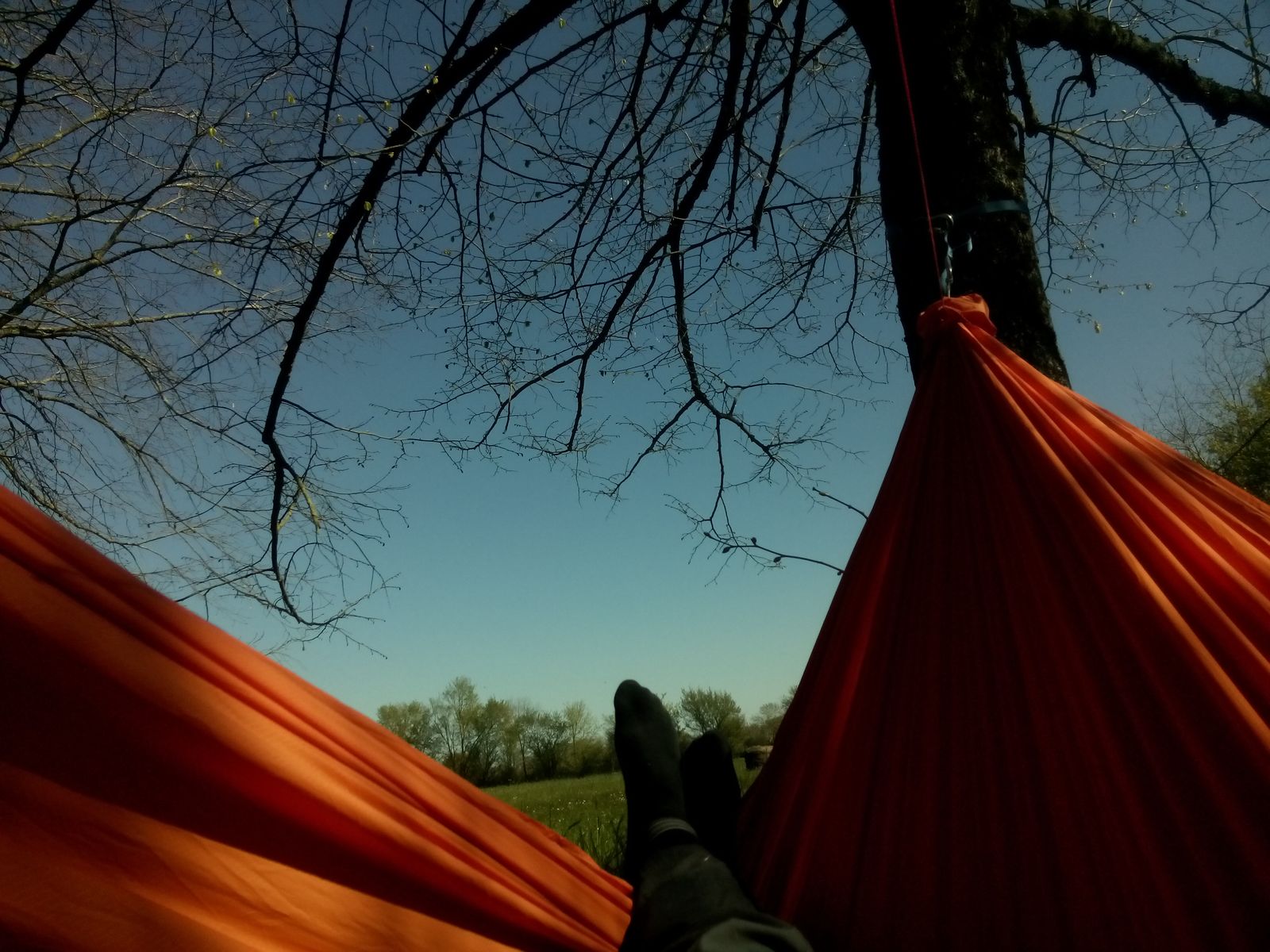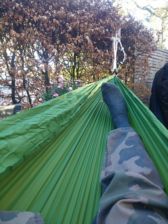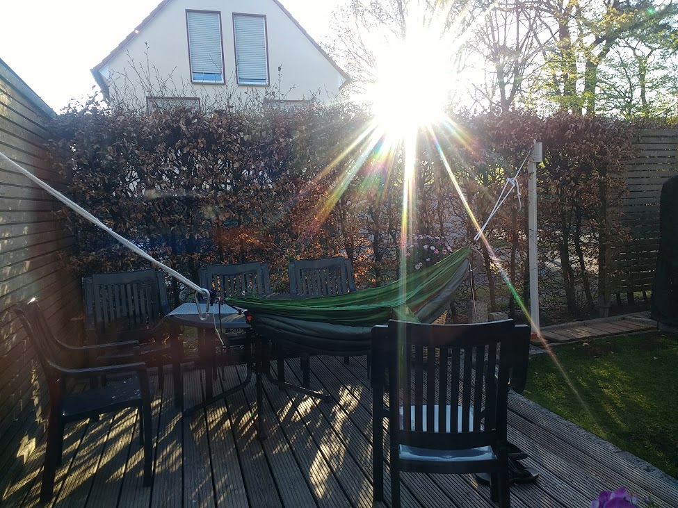 Jacke aus, Schuhe aus, Hose und Hemd aus, T-Shirt und Jogginghose an und in die Hängematte gelegt. Herrlich, wenn alles von einem abfällt, wenn es nur zwei Dinge gibt: die Hängematte mit Mittagsfrost und irgendwo weit entfernt die Welt da draußen. Ach, ist das Leben schön!