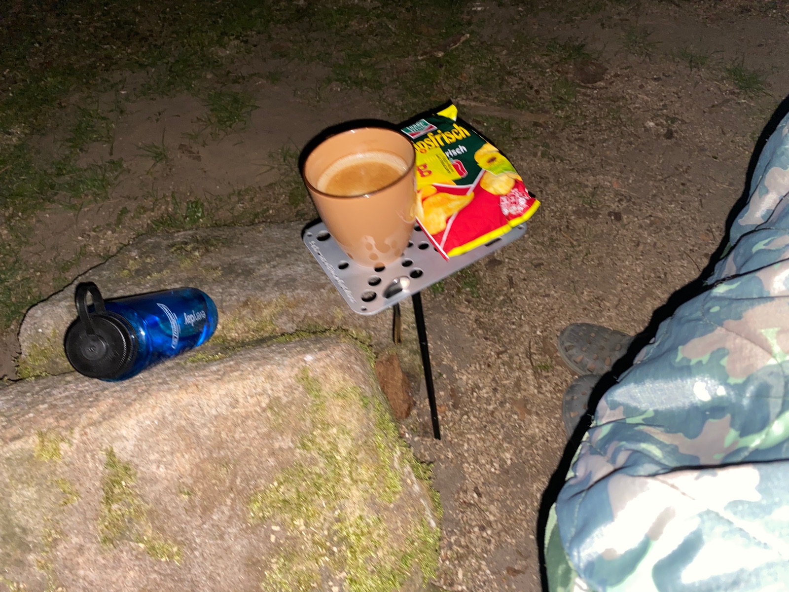 Vielleicht war ich auch nur zu ungeduldig und wollte den Sternenhimmel sehen? Egal. Temperaturmäßig ging das bis in die frühen Morgenstunden rein gut. Natürlich war es gestern Abend bei 10c° noch gut gemütlich, die Nacht über, auch mit den sinkenden Temperaturen war auch nicht das Problem. Am frühen Morgen mit grob erspähten 5c° oder wohl auch etwas weniger auf dem "Tacho" war dann zuziehen der Mütze und Kragen angesagt.