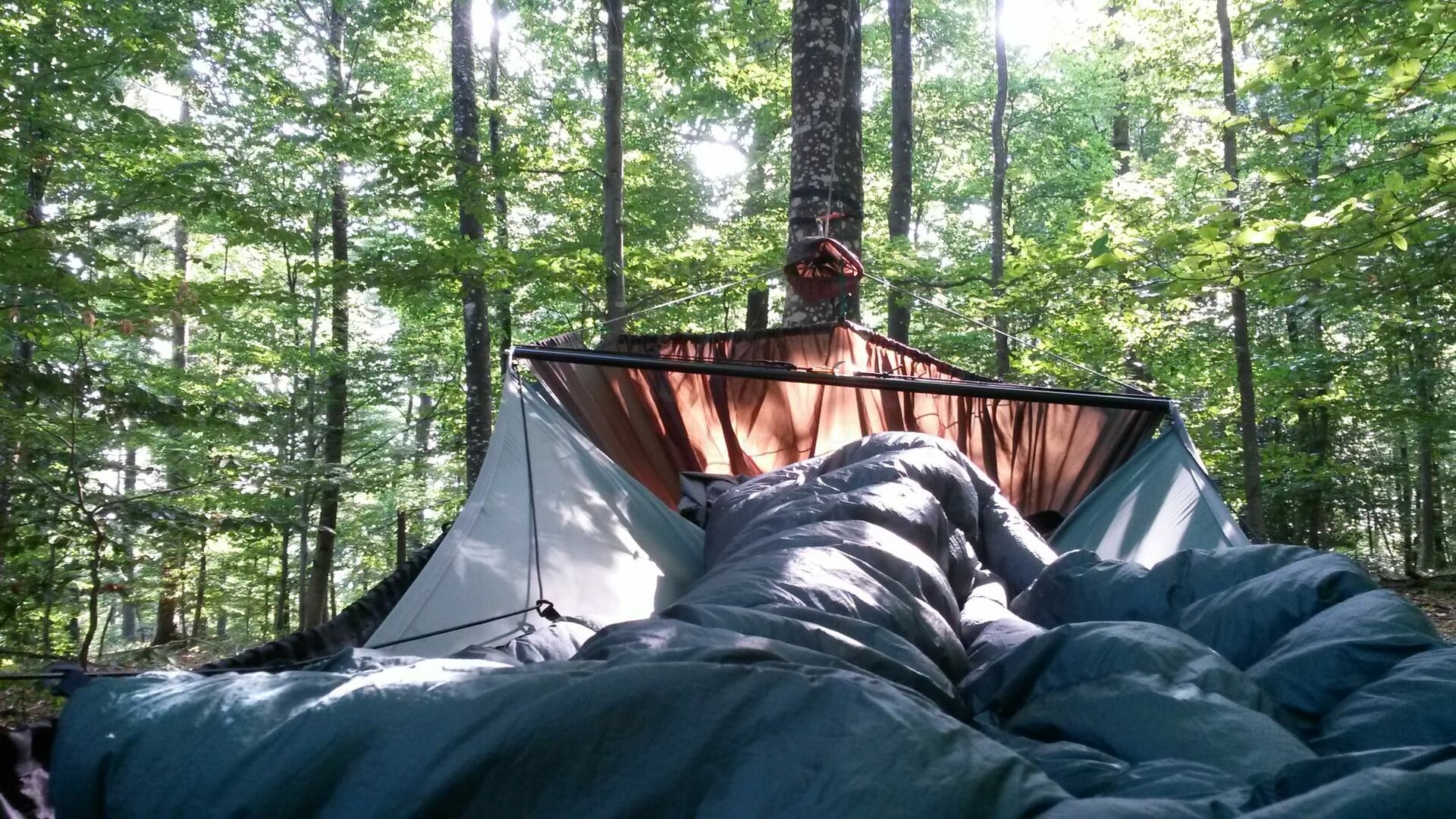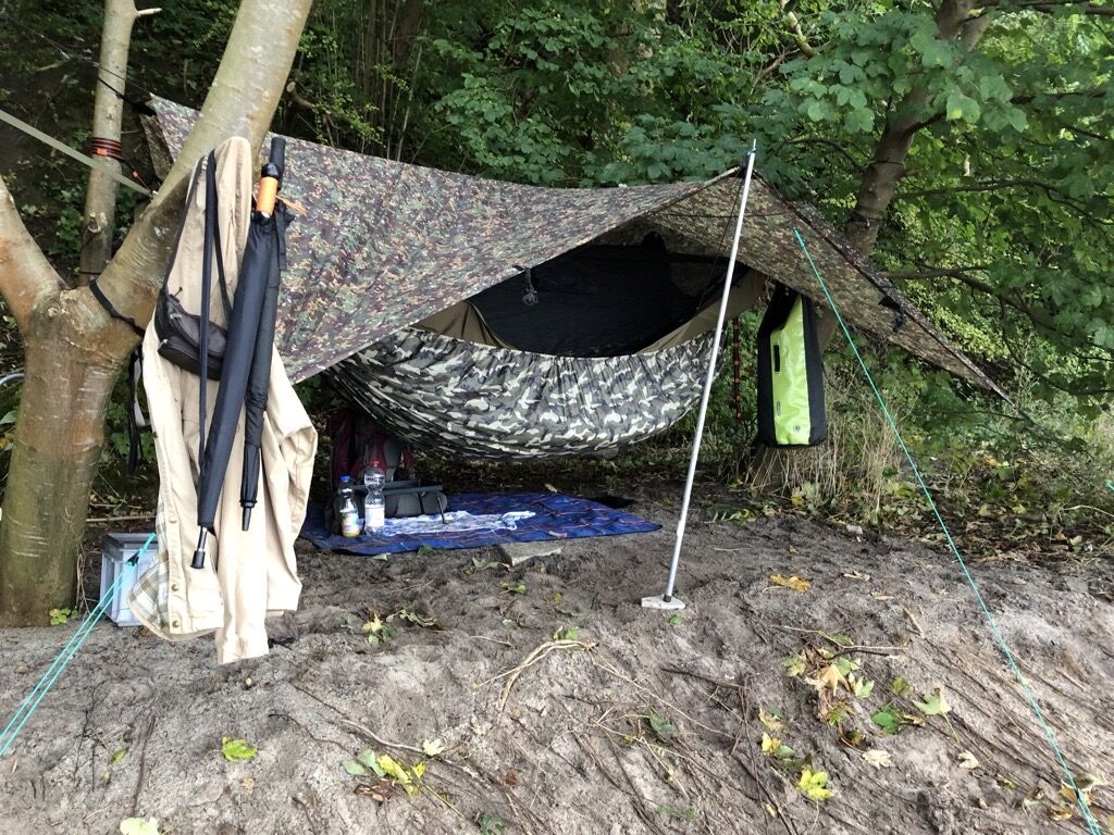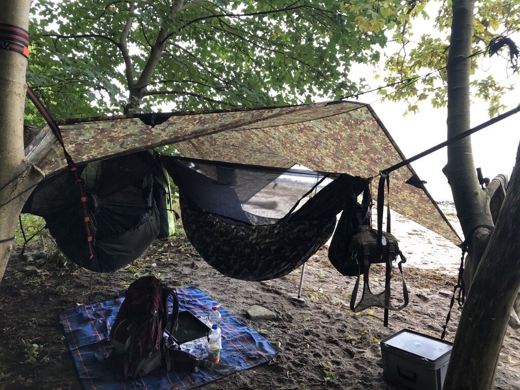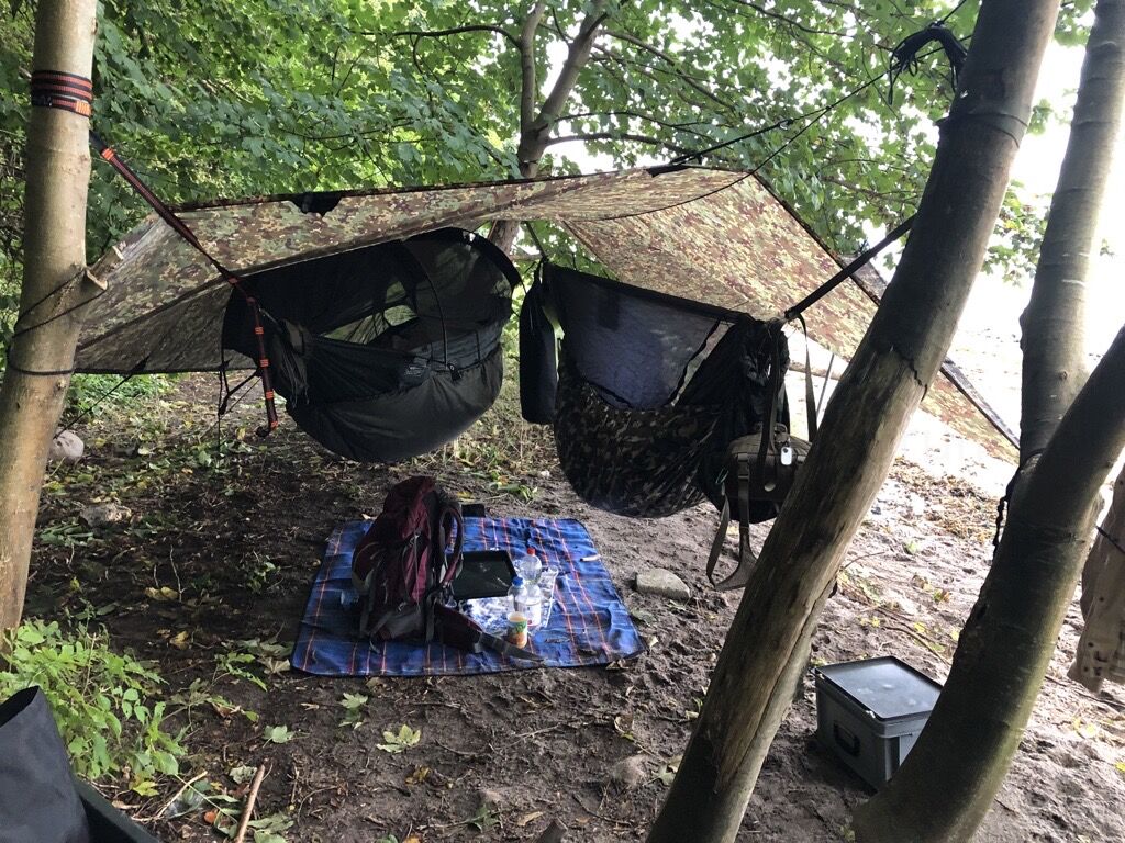 In der ersten Nacht hatten wir gefühlt einen Viertelliter Tau auf dem Tarp, während es in der zweiten Nacht absolut trocken blieb, weil sich das Wetter, das zunächst noch 30° betrug, um 10 Grad abkühlte.