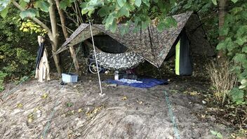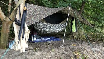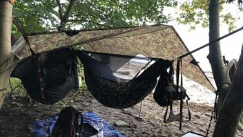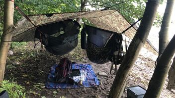 Zusehen ist die SLD Trail Lair (rechts) und die DD Hammock Jungle Modular unter einem DD 3,5x3,5m Tarp.