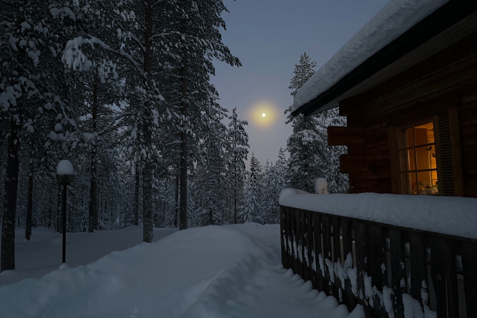• Nachdem wir Weihnachten bei meinen Schwiegereltern in Lahti verbracht hatten, sind wir gestern ins Auto gestiegen und noch einmal 10 Std weiter gen Norden gefahren. Gelandet sind wir in einer Gegend, in der die Sonne heute um 10:39 Uhr aufgegangen und um 13:15 Uhr untergegangen ist - klingt schattig, ist es auch 😉 Heute Morgen sah es gegen 9 Uhr durch Reflektionen auf Wasser im festen Aggregatzustand allerdings nicht ganz so finster aus:
