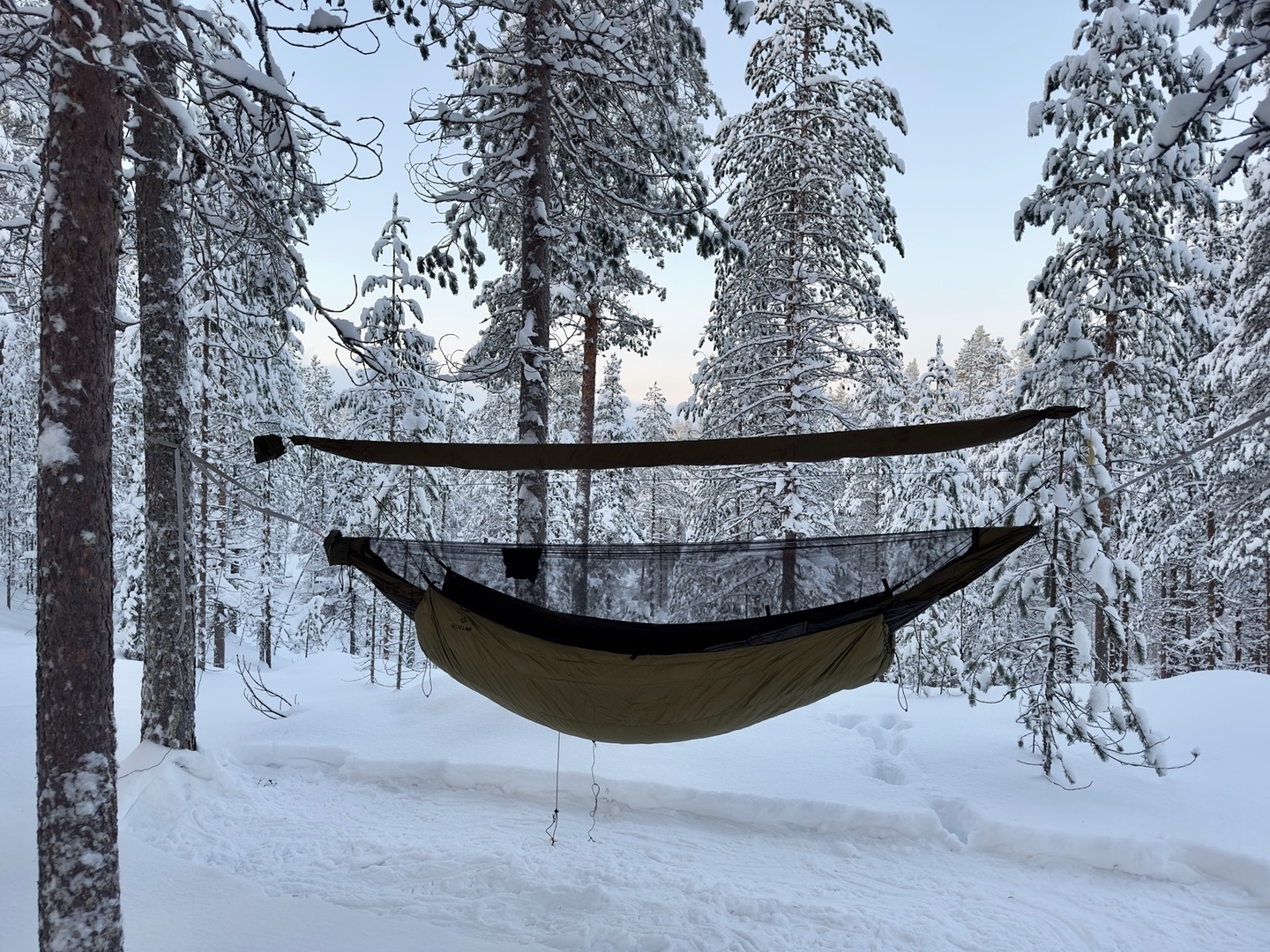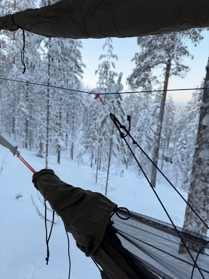 Als Isolierung von unten dienen ein 20F symmetrischer Trail Winder gestackt mit einem Cumulus Selva 450 und darüber ein UQP. Die Kombination hat mich schon problemlos bis -17°C gebracht. Ich bin gespannt, wie weit ich mit der Kombi noch komme. Meinen Selva spanne ich in der Regel an der Tarpridgeline (oder wenn ich mein Khibu-Tarp verwende an einer separaten Ridgeline) ab: