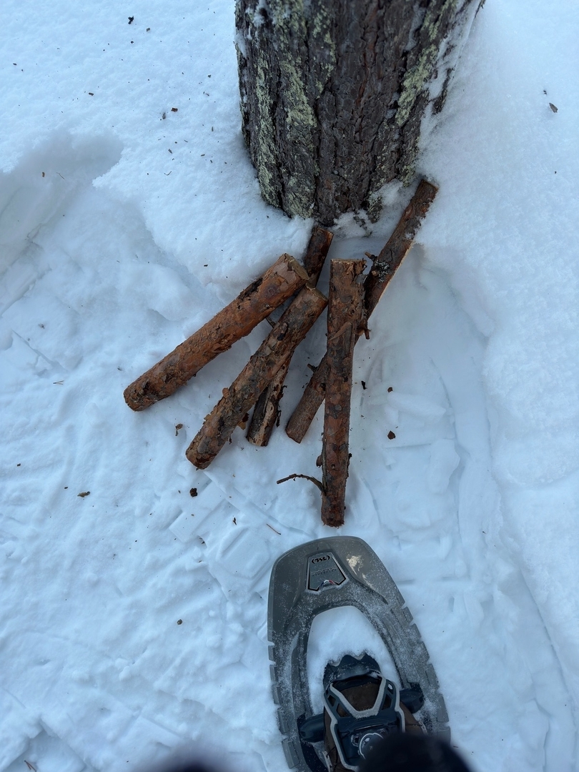 Das Tarp wird bei Bedarf mit einigen Hölzern im Schnee abgespannt