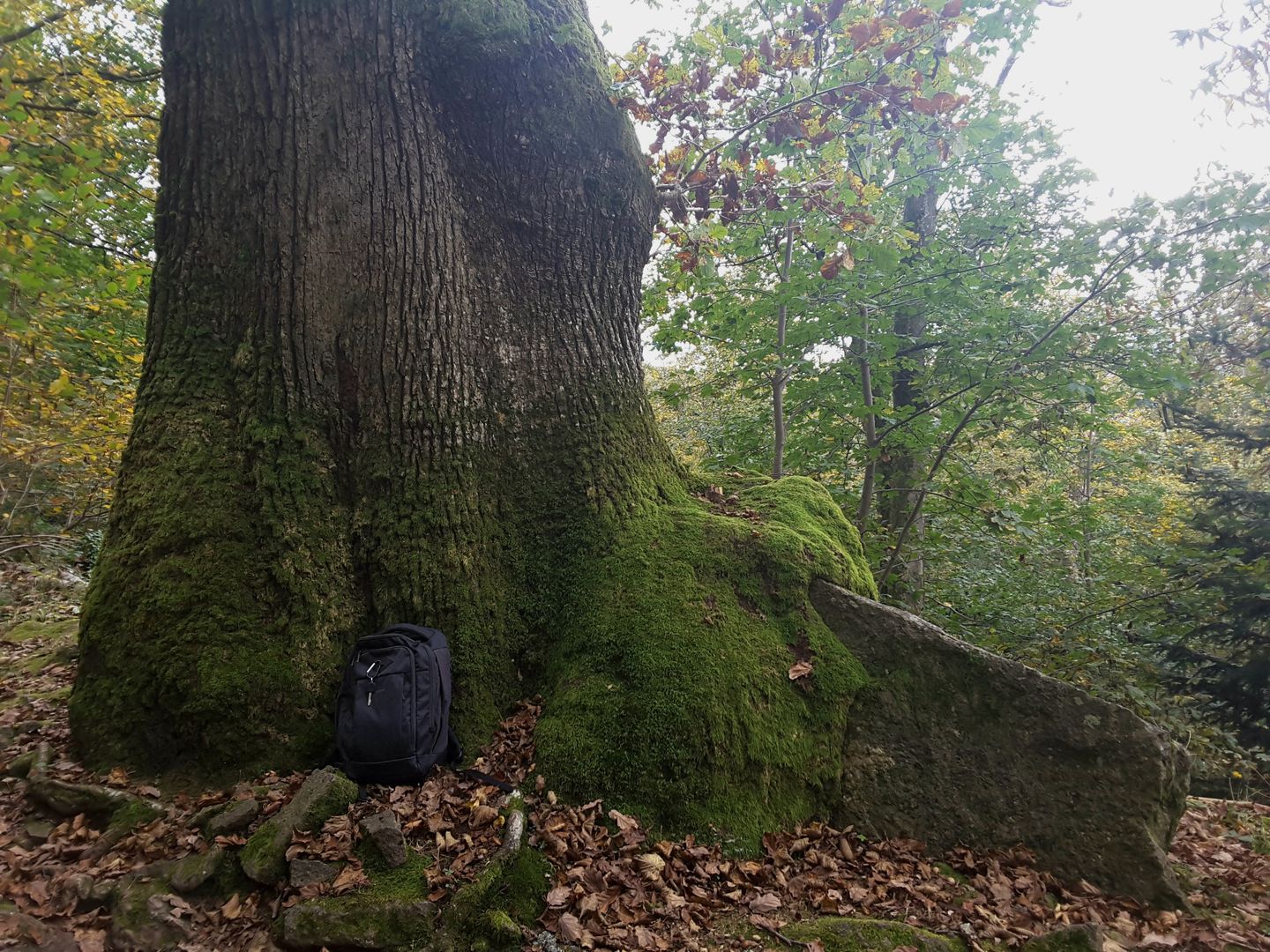 Das hier ist meine Lieblingseiche: sie hat einen Stammumfang, dass 3 Personen sich an den Händen fassen müssen, um 1x rum zu kommen und mir gefällt, wie der Stamm den Felsen daneben überwachsen hat