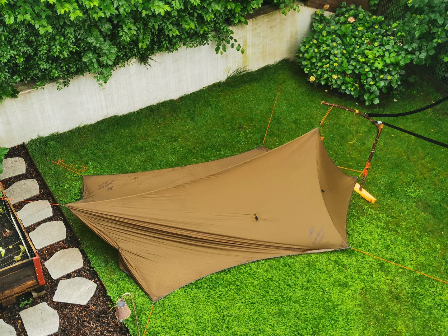 In der vergangenen Gewitternacht wollte ich mein Zeug bei Starkregen testen. Also alles schön aufgebaut und bis 4:30 Uhr ging es auch gut, doch dann merkte ich dass ich den Boden berühre. Also bin ich kurz aufgestanden und hab etwas nachgespannt. Das hat soweit funktioniert, denn als ich mich wieder hinlegte, schaukelte ich schön. Doch 10min später hörte ich ein leises Knacken, dann wieder und wieder und dann lag ich am Boden 😂