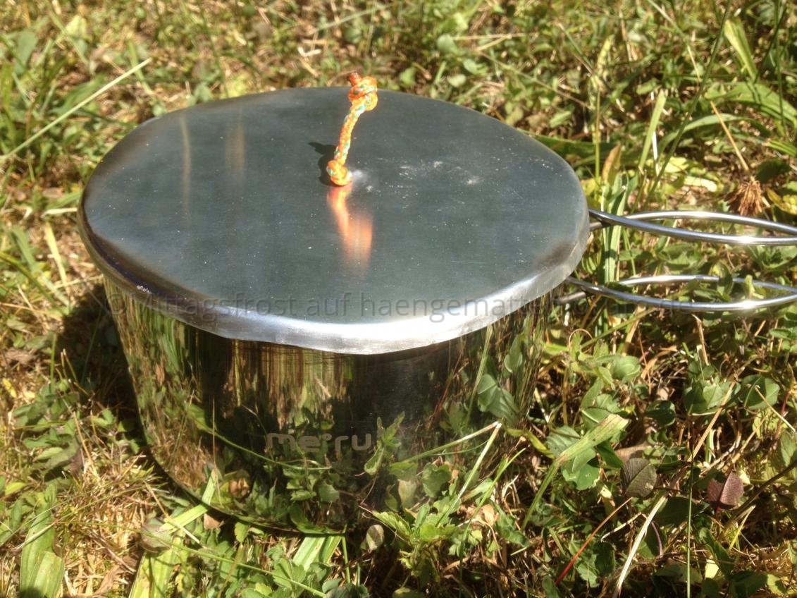 Ich habe mir aus einem Stück Alublech einen Deckel für den kleinen Kochtopf gebastelt. Was Kahel kann, kann ich auch :)