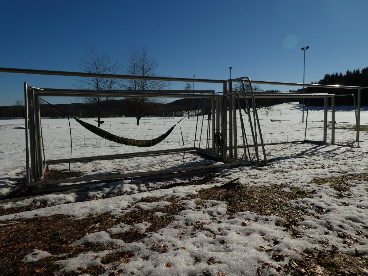 Und als Hängerin bin ich natürlich immer auf der Suche nach einem Platz zum HM aufhängen: in diesem Fall die leeren, beiseite gestellten Fußballtore auf einem Sportplatz: