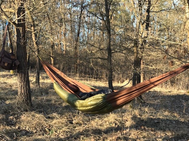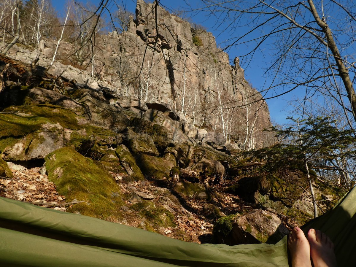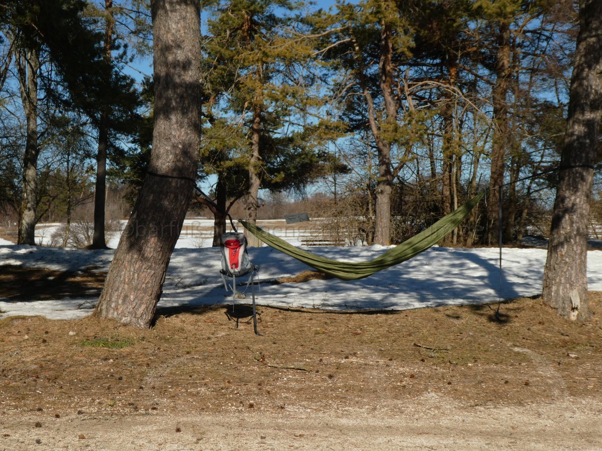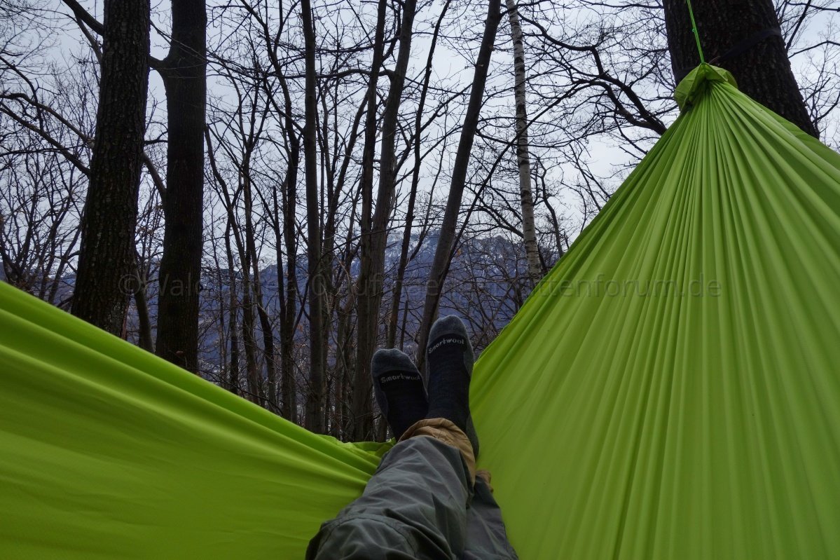 Bei dem Sonnenschein heute hätte ich wie alle Leute spazierengehen und das schöne Wetter genießen können. Stattdessen bin ich im Dienst der Hängemattenwissenschaft in den Wald gegangen und habe einen weiteren Praxistest der WhoopieHook-Venom-LoopAlien-Aufhängung durchgeführt.