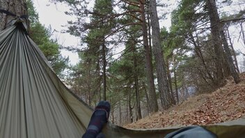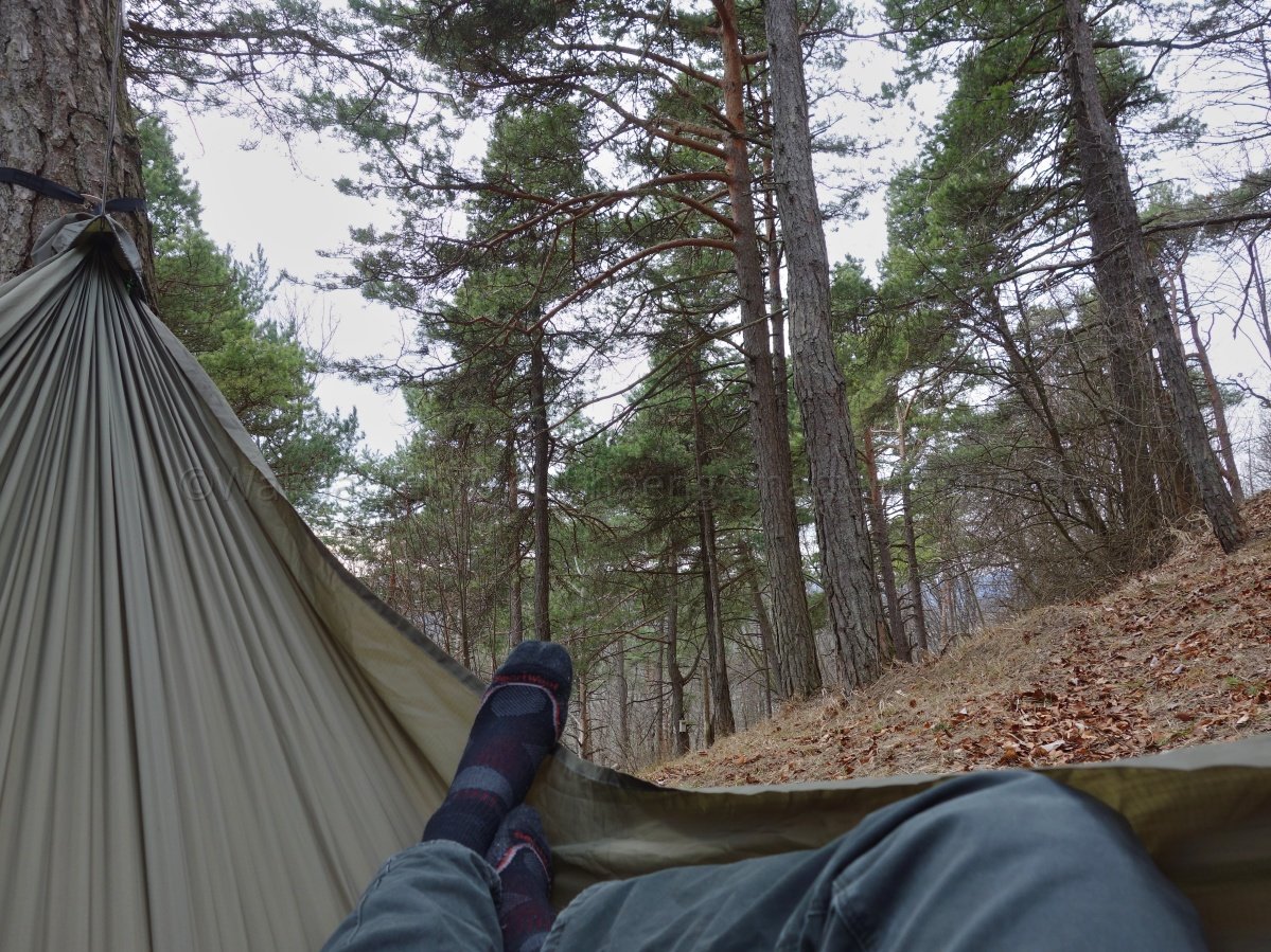 Natürlich musste im nächsten Schritt überprüft werden, ob die Evo-Loops, die ich für den Übergang von den Schnallen zur Hängematte eingebaut habe, auch wirklich halten. Ich liess meinen Blick über die Kiefern schweifen, die mich umgaben: