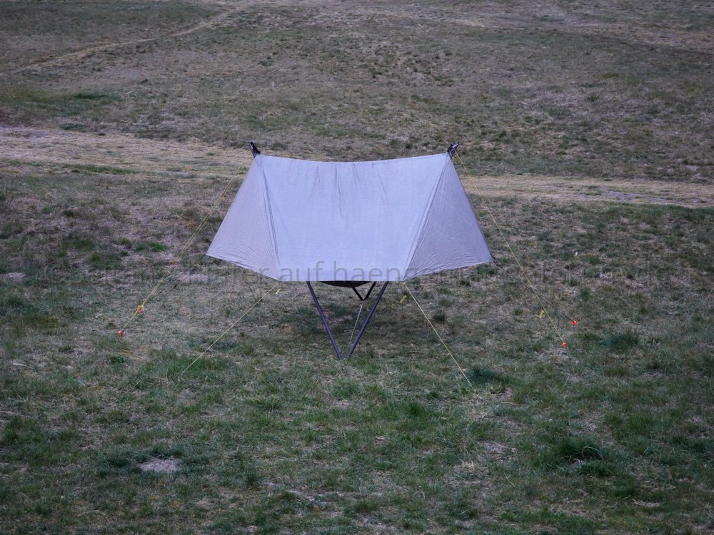 In den ersten Nächten gab es mächtig viel Tau. Zunächst dachte ich, dass ich den mit dem Tarp abwehren kann, aber das hat überhaupt nichts gebracht, deshalb habe ich das Tarp in den Folgenächten weggelassen. Der außen nasse Schlafsack war nach dem Frühstück immer schon wieder trocken.In der letzten Nacht zu heute gab es viel Wind und auch Regen. Das DCF-Tarp mit Türen hat mich perfekt geschützt. Zunächst konnte ich allerdings nicht einschlafen, weil ich mir ausgemalt habe, dass der Sturm mir den Ständer umreißt. Aber das ist nicht passiert - dank der 4 Orange Screws (kleine Größe). Mein Zutrauen zu dieser Konstruktion ist damit noch mal gewachsen.