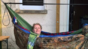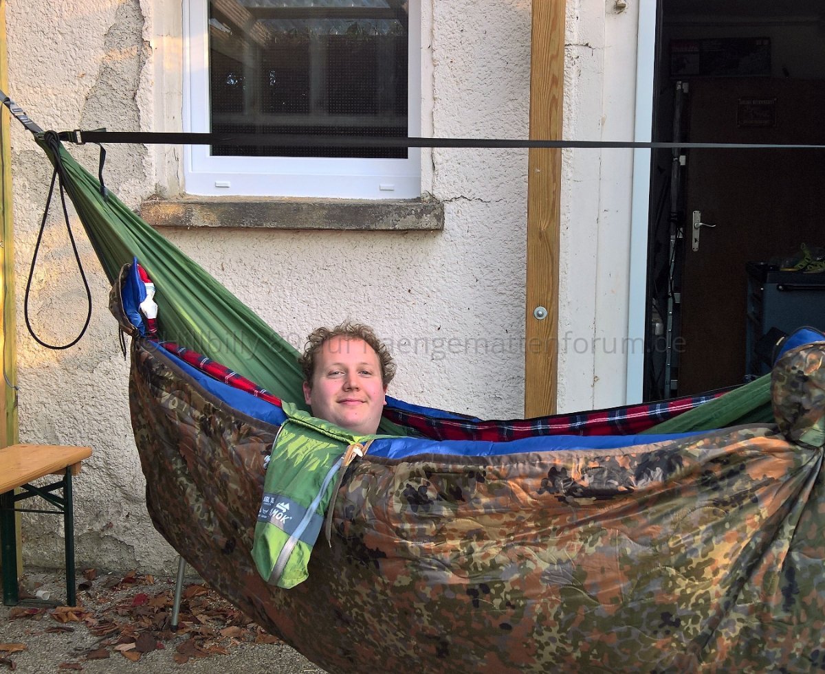 Zunächst mal hab ich mich gestern Abend draußen auf meiner Burgterrasse ( Testgebiet ) in die Hängematte gelegt, daß ganze natürlich mit dem Hintergrund den neuen Schlafsack zu testen. Erwartet Niedrigtemperaturen laut Onlinewetterfrosch in den Morgenstunden nahe bei 5c°.