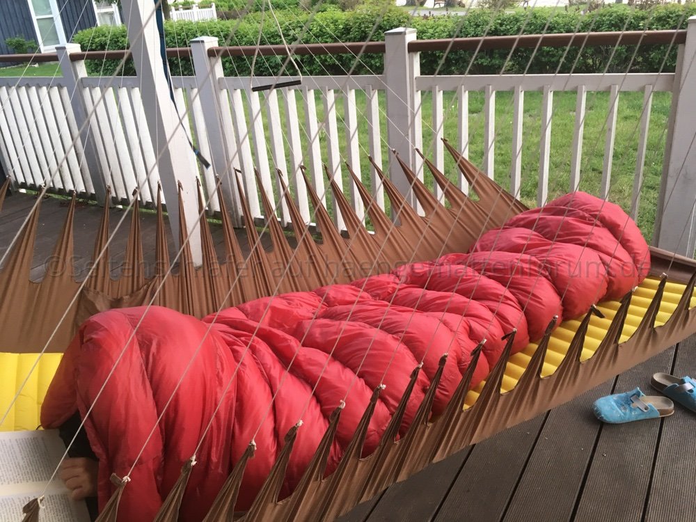 Zumeist schlafe ich im Bett und nicht in der Hängematte. Gestern war ich extrem verspannt, hatte Rückenschmerzen und zudem tat mein Kiefer noch sehr weh (habe im Bett irgendwie auf dem Bauch geschlafen und lag wohl doof auf dem Gesicht). Das Einschlafen im Bett fiel mir zudem vorgestern sehr schwer. Also habe ich die letzte Nacht in der Hängematte verbracht. Was soll ich sagen? Schon beim Reinlegen sagte ich laut: "Ist das geil!". So bequem liegend und umschmeichelt von dem Hexon 1.0 habe ich mich gefühlt. Ich war so schön ausgestreckt und dann schlief ich auch schon. Sehr erholsam und tief war der Schlaf, kein einziges Mal wachte ich auf (was mir in der Hängematte nicht immer gelingt). Heute Morgen dann weitere positive Nachrichten. Der Rücken fühlt sich deutlich besser, keine akute Verspannung mehr. Zudem sind die Kieferschmerzen verschwunden, da ich ja nicht wieder ungünstig auf dem Bauch schlafen konnte.