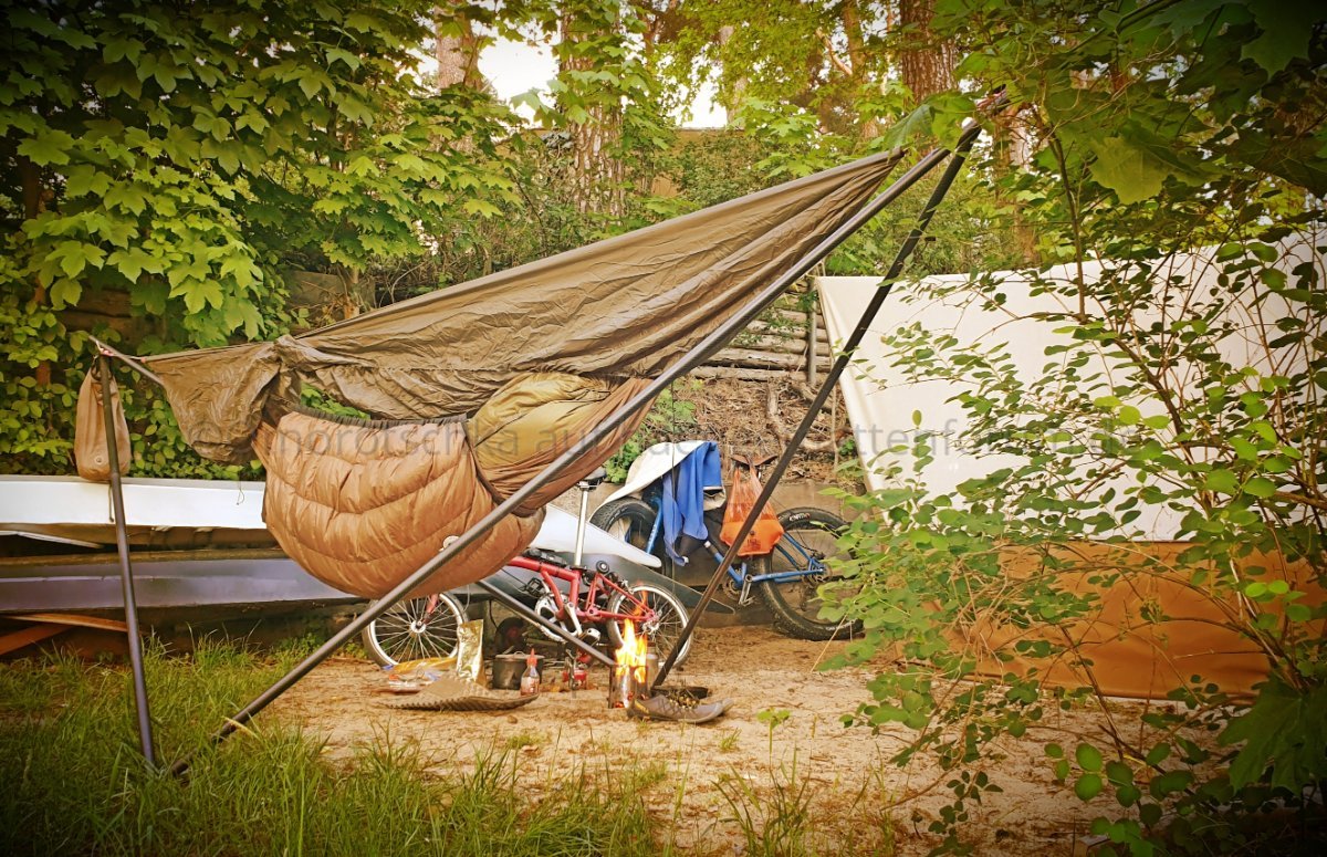 Der Mai ist dieses Jahr bei uns der Monat der Familientreffen. Bei lausekaltem Wetter habe ich die erste Nacht am Scharmützelsee auf der Veranda eines Ferienhauses gehangen, in der zweiten Nacht musste ich allerdings gegen 3:00 Uhr bei -1° das Innere aufsuchen, weil sich der Schlafsack als zu dünn erwies.