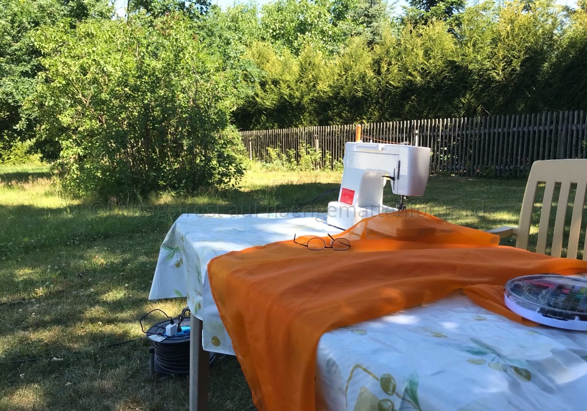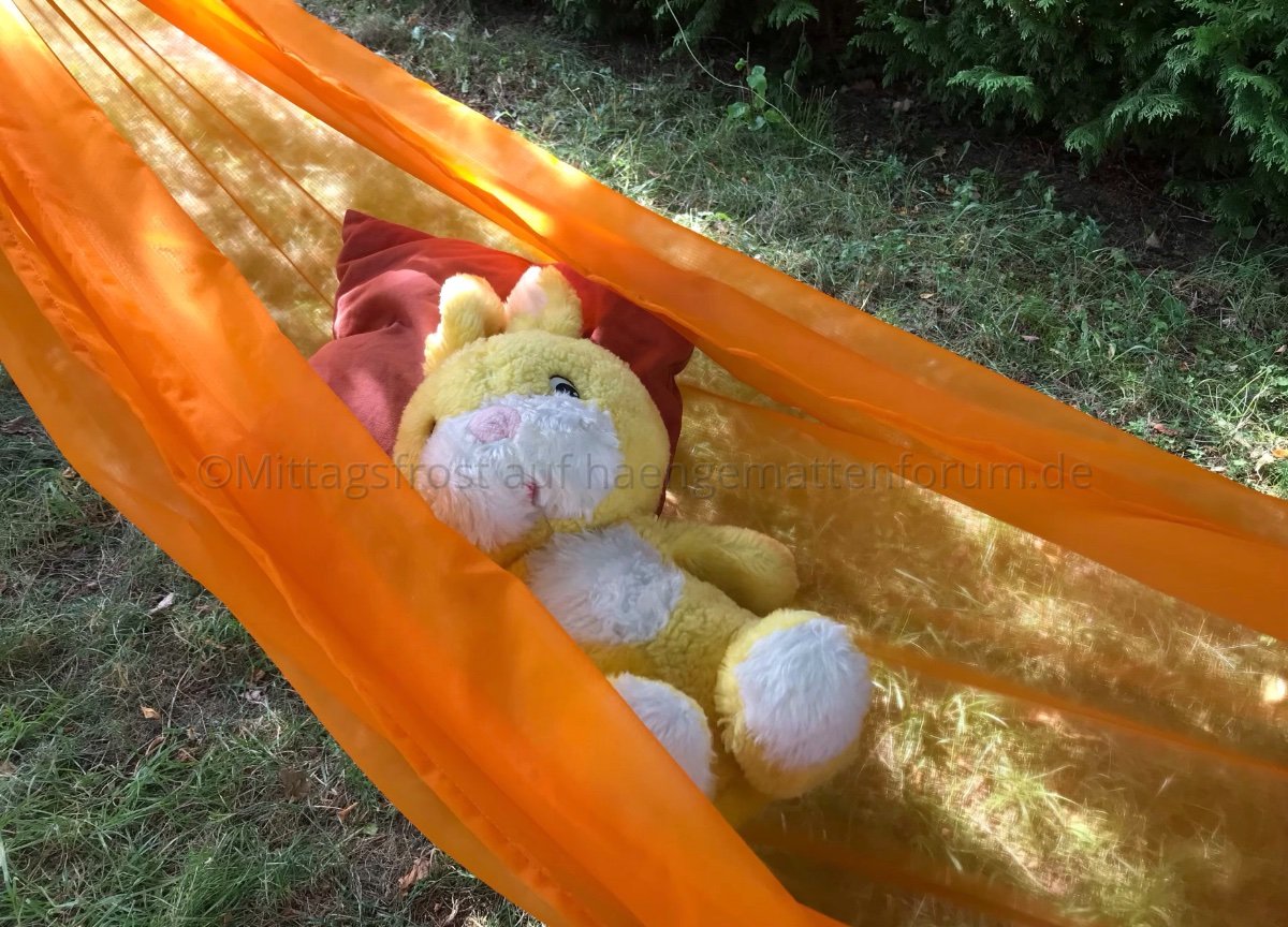 Ich habe mir am Freitag in Berlin 3,5 m Monofil in orange gekauft und heute im Garten eine Hängematte daraus genäht. Ja, nicht nur xuanxang ist ein Outdoornäher. :)