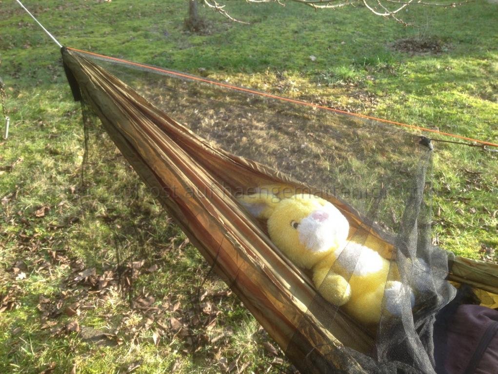 Eine Stunde später war die Bastelei dann fertig. Keine Schönheit, aber es funktioniert. Sicherheitshalber (damit ich nicht wieder gleich ins Koma falle) legte ich mich nicht selbst in die Hängematte, sondern gab dem Plüschhasen eine Chance als Tester.