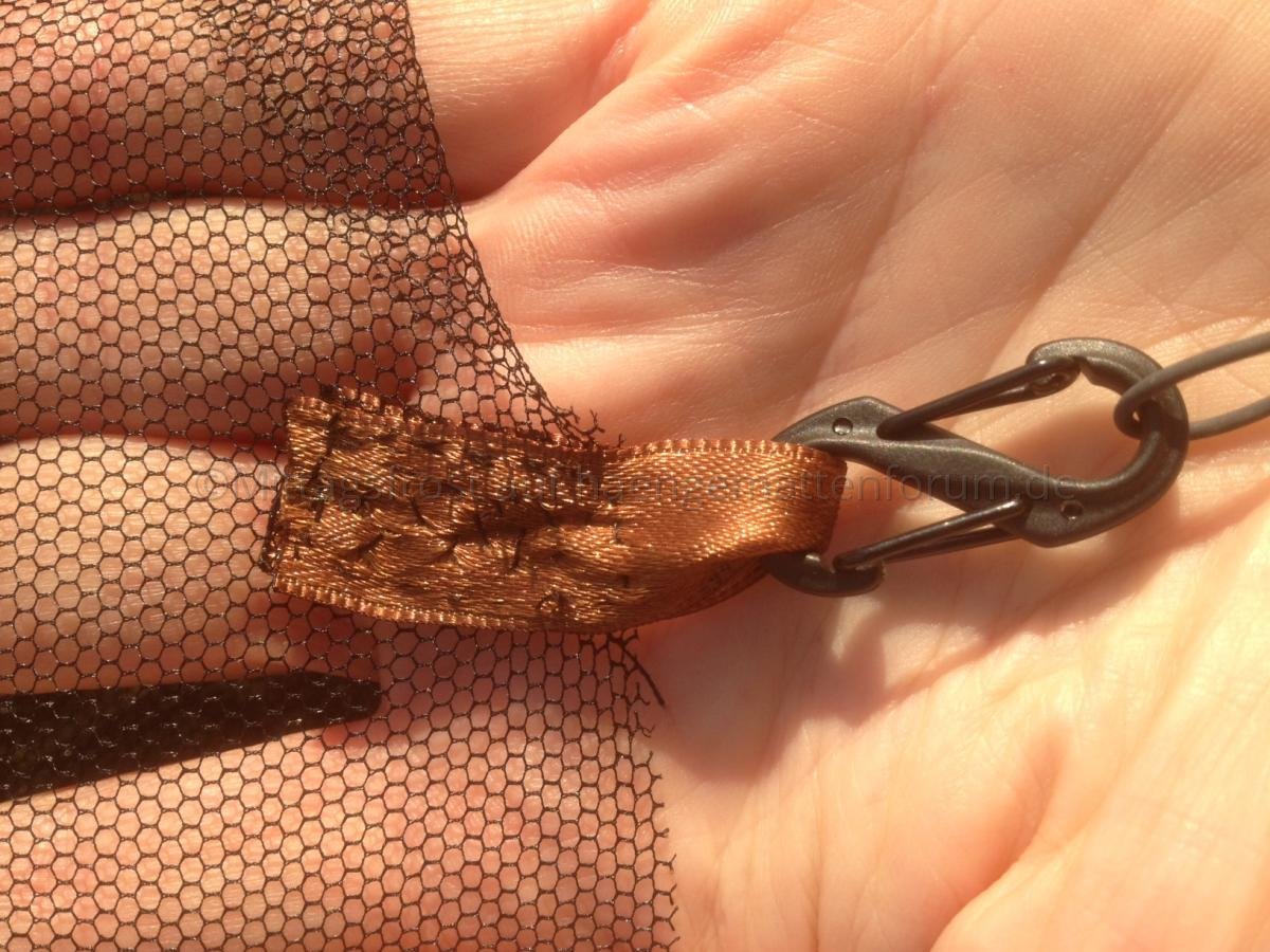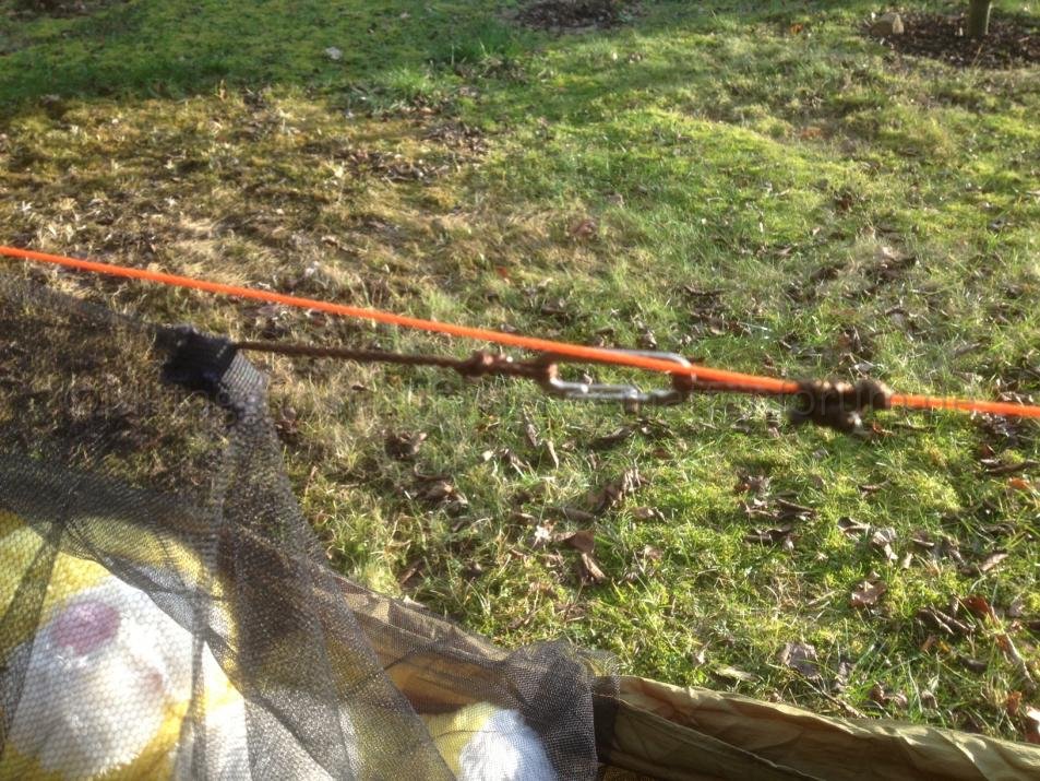Die Gummischnur wird unter der Hängematte durchgezogen und an der anderen Seite (hier mit S-Biner) an der Lasche befestigt. Dadurch schmiegt sich das Half Bug Net schön an die Hängematte an.
