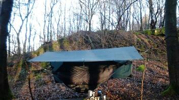 Nachdem ich gestern den Beutel mit den Heringen und der Schnur vergessen hatte und improvisieren musste, wollte ich heute mal ein Schläfchen in der KOMA machen und mein neues Tarp einmal richtig abspannen. Leider machte mir der stark böige Wind einen Strich durch die Rechnung.
