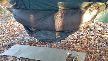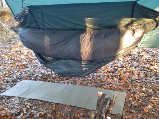 Weil ein allein hängendes Tarp doof aussieht, habe ich noch eine Hängematte drunter gehängt. Sie hing da so schlaff da, also habe ich eine Isomatte reingelegt um sie etwas zu spreizen. Dazu noch den verpackten Schlafsack als Gewichtsstück. Perfekt! Die Tarpaufhängung funktionierte wie erhofft. Wunderbar!