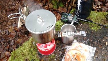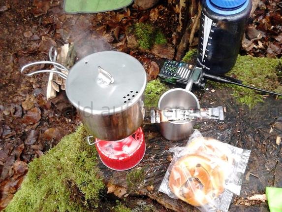 Nach einem Kaffee, den ich mal auf dem 25g Titan Gaskocher gemacht habe und zwei Rosinenbrötchen ging es dann ans Abbauen.