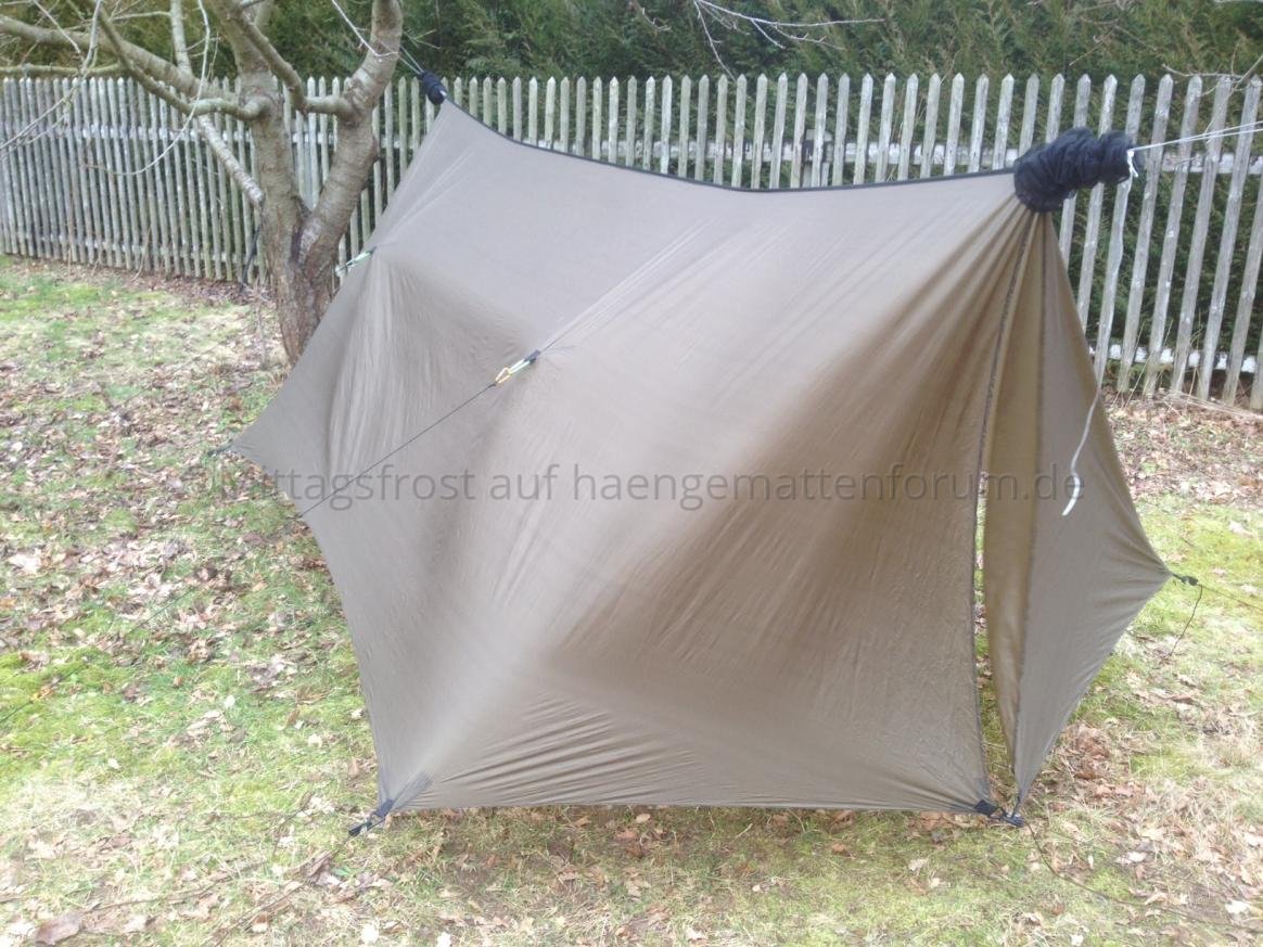 Als ich ins Gartenhaus trat, um den Schuppenschlüssel zu holen, fiel mein Blick auf das Tarp, das ich nach dem Hängemattentreffen letztes Wochenende zum Trocknen aufgehängt hatte. Es war trocken und konnte nun ordentlich verstaut werden. Aber vielleicht probiere ich vorher noch die neue Abspannung aus, die ich auf dem Treffen erworben habe? Gesagt, getan.