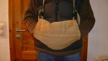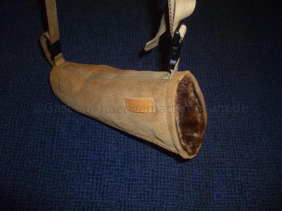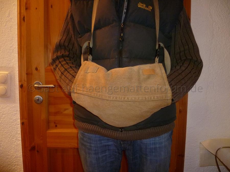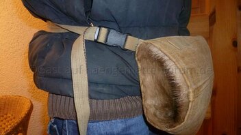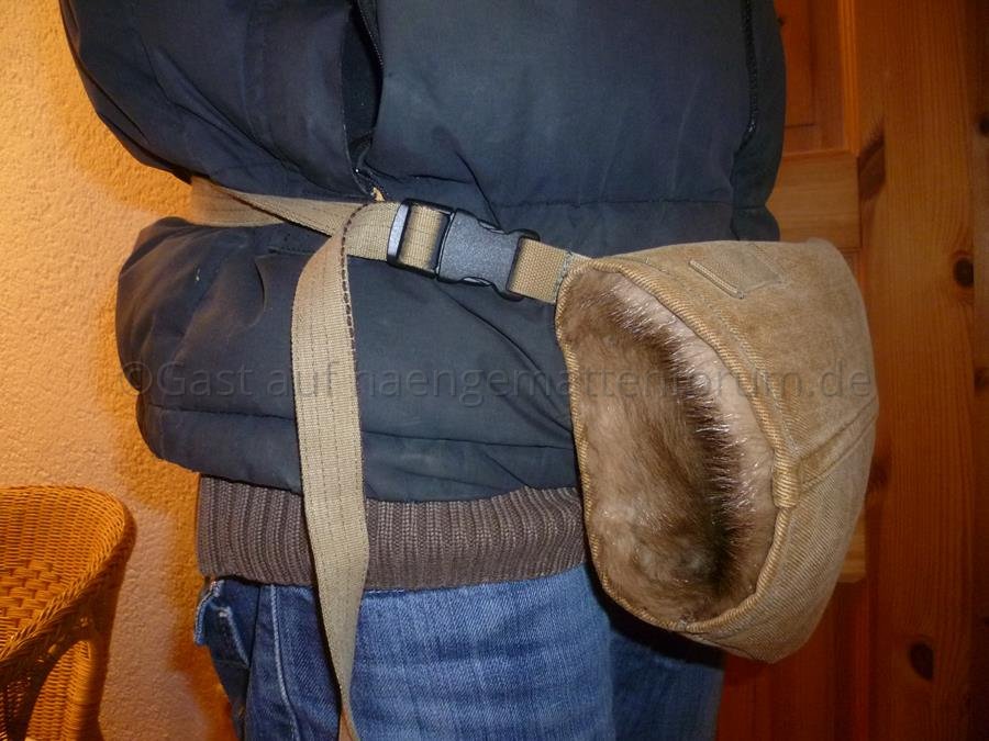 Ich habe den Muff so gemacht ... dass ich zwei unterschiedliche Trageweisen habe. Einmal um den Nacken gehängt und dann noch mal um die Hüfte geschnallt.