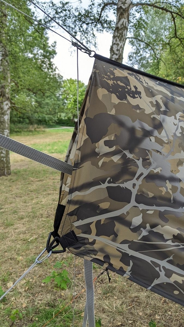 ich liege, nein hänge zur Zeit im Garten. Das neue Tarp aus dem BW Shop wurde zum zweiten Mal angespannt, was ein wenig tricky war. Aber halb so wild, wenn ich erstmal das Muster drin habe, dann klappt's auch beim nächsten Mal besser.