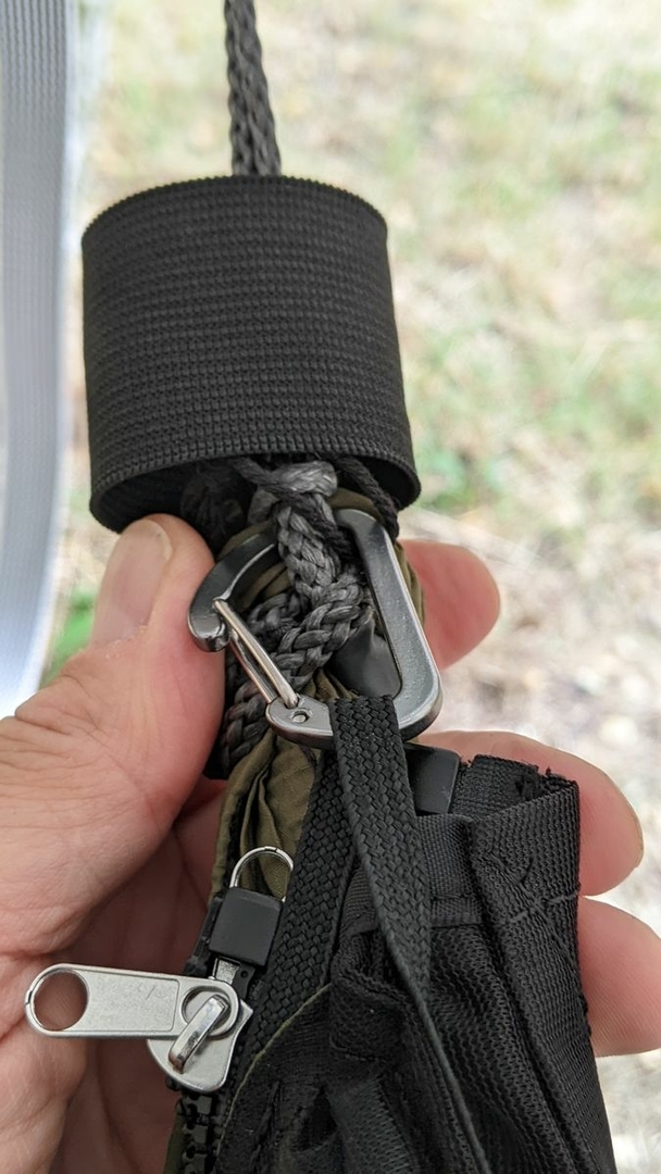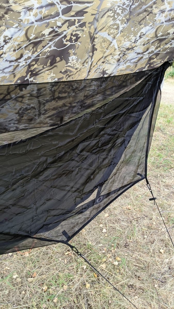 Da das Paracord die gleichen aber leider auch geringfügig flexiblen Abspannpunkte wie die Cocoon nutz, sackt das Tarp beim liegen in der Cocoon nach.