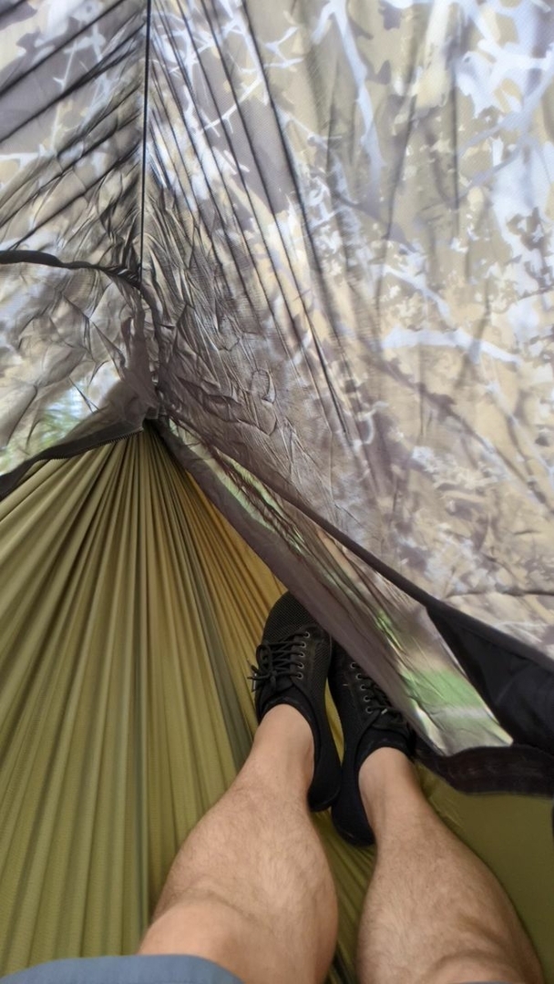 Dafür beschäftigte ich mich mit der Aufhängung des Tarps in unterschiedlichen Höhen, den Minitüren, der Abspannung und dem (Half-)Porch-Mode. Die Hinweise an der Matte wurde "studiert" und verinnerlicht und das Moskitonetz wurde einmal komplett abgenommen und inkl. Footbox und Shelf inspiziert. Weiterhin Early Grey getrunken, Musik gehört, gelesen, abgehangen.