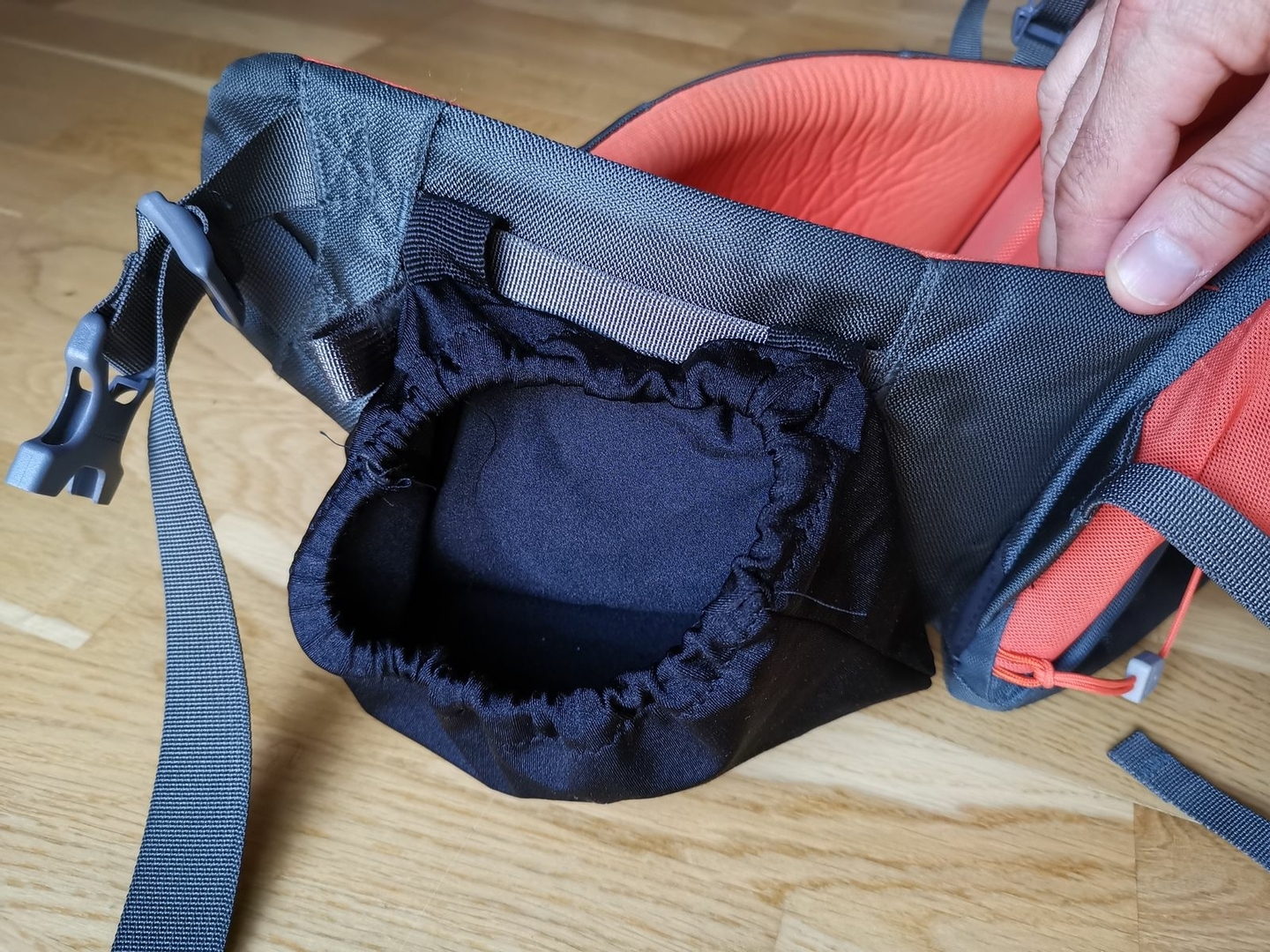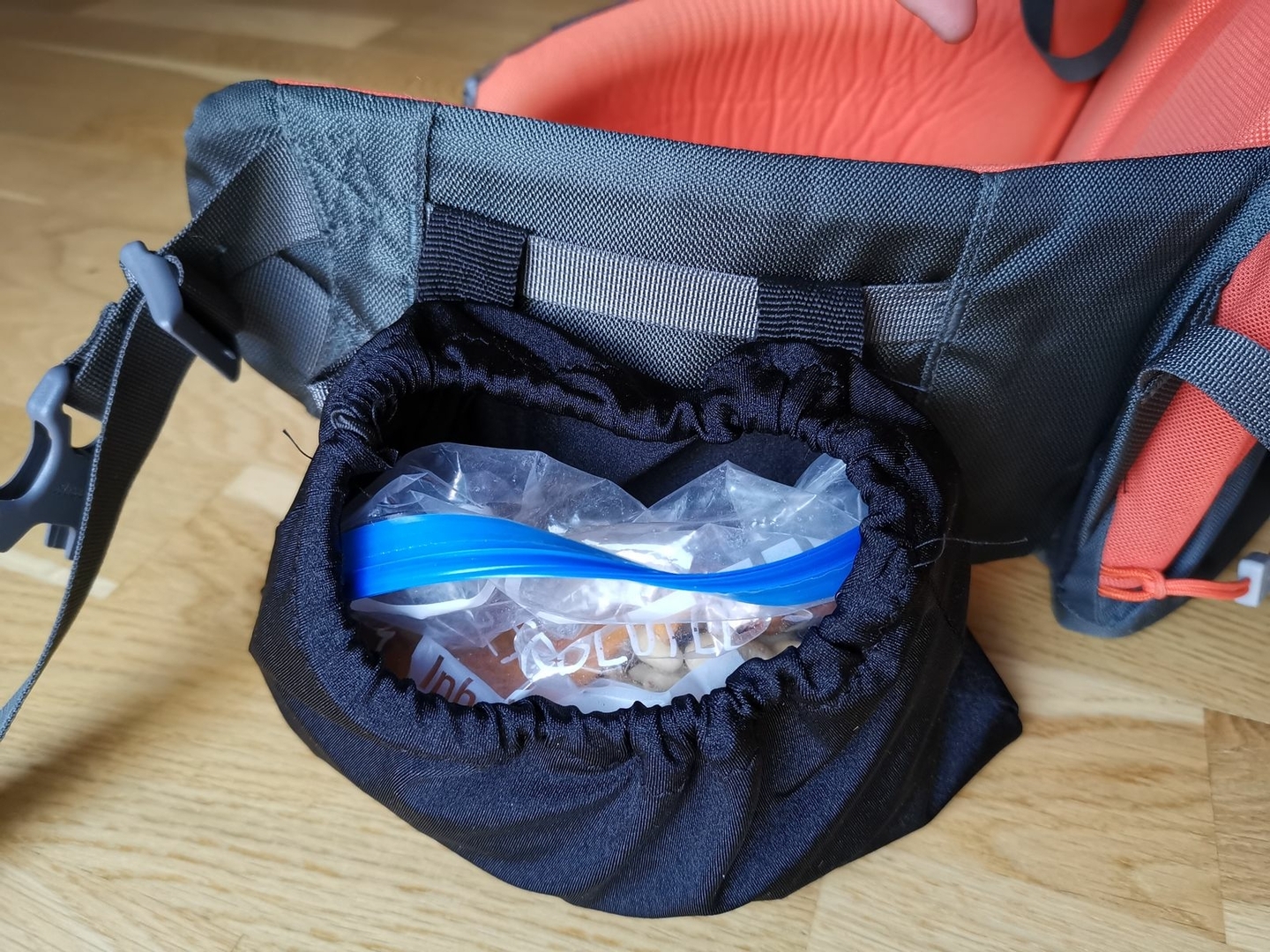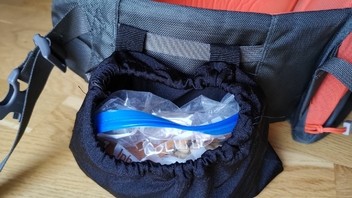 Vorher habe ich mir aus ein bisschen Stoff eine Hüftgurtseitentasche genäht und damit sage und schreibe 70g gespart im Vergleich zu meiner gekauften. Abgesehen davon macht Nähen auch Spass, wenn ich erst mal die Maschine ausgepackt habe.
