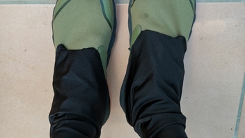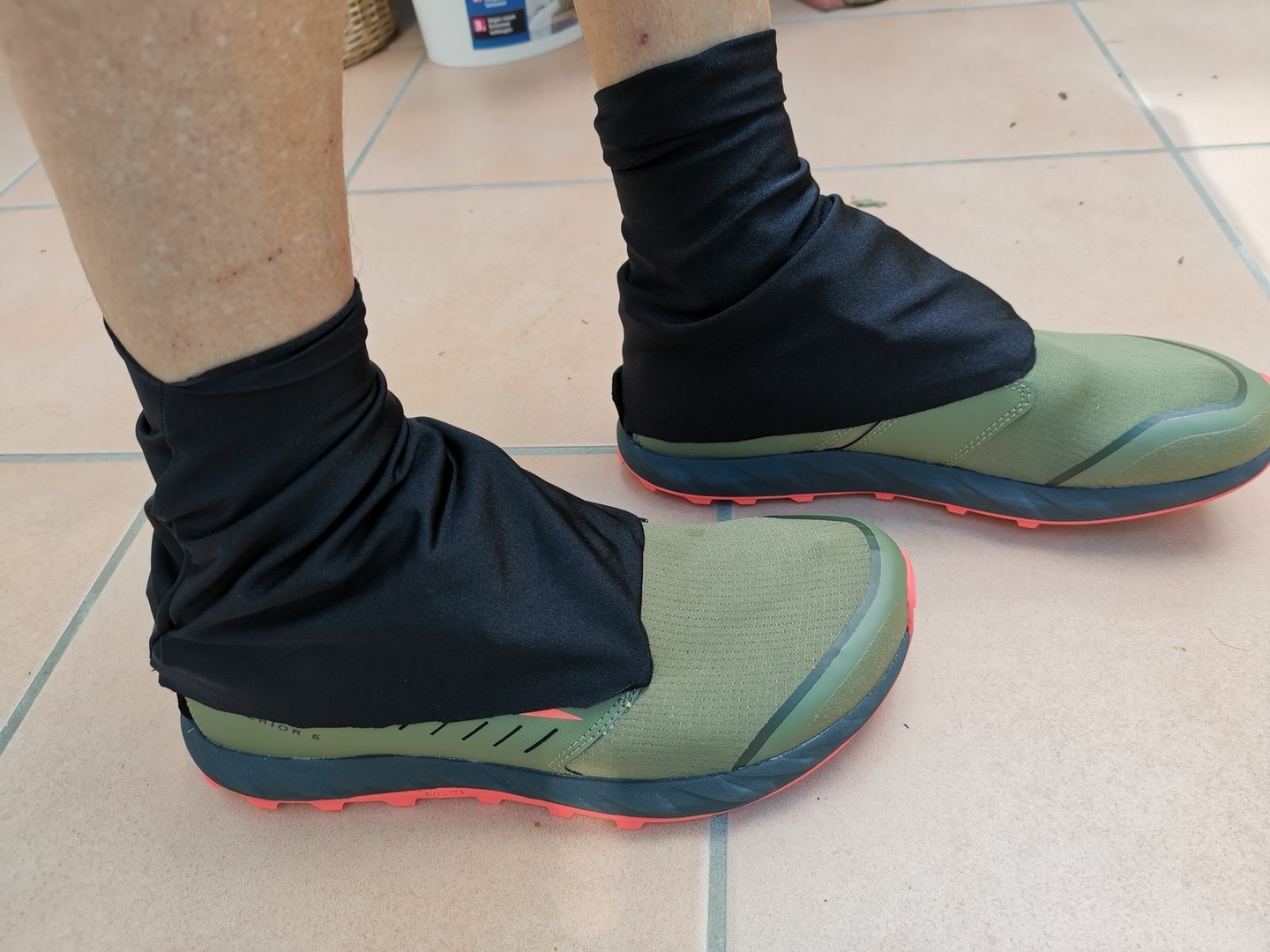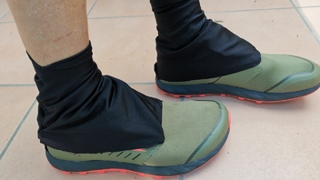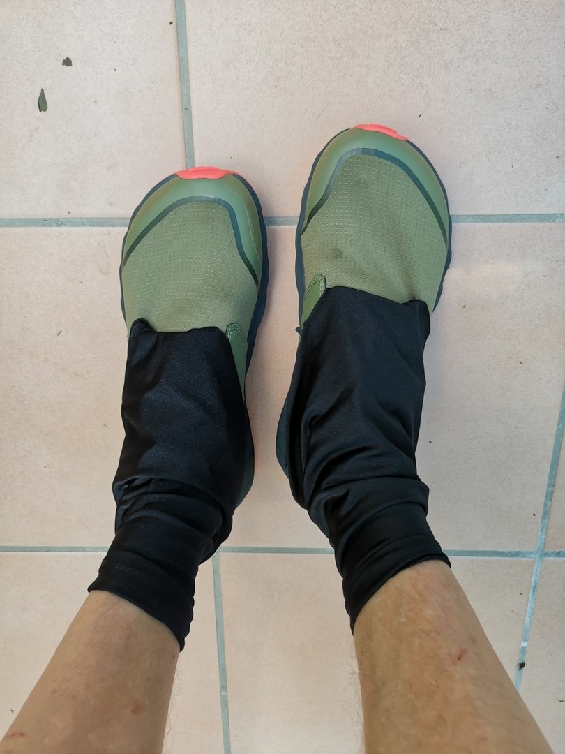 Und weil ich schon dabei war, und gesehen habe, dass die Altra Superior Klett an der Ferse für Gamaschen haben, aber die käuflichen Exemplare nicht mehr rechtzeitig ankommen, habe ich mir noch Schmutzfanggamaschen aus dem Stoff gepfrimelt.