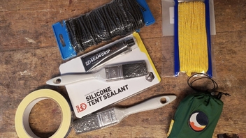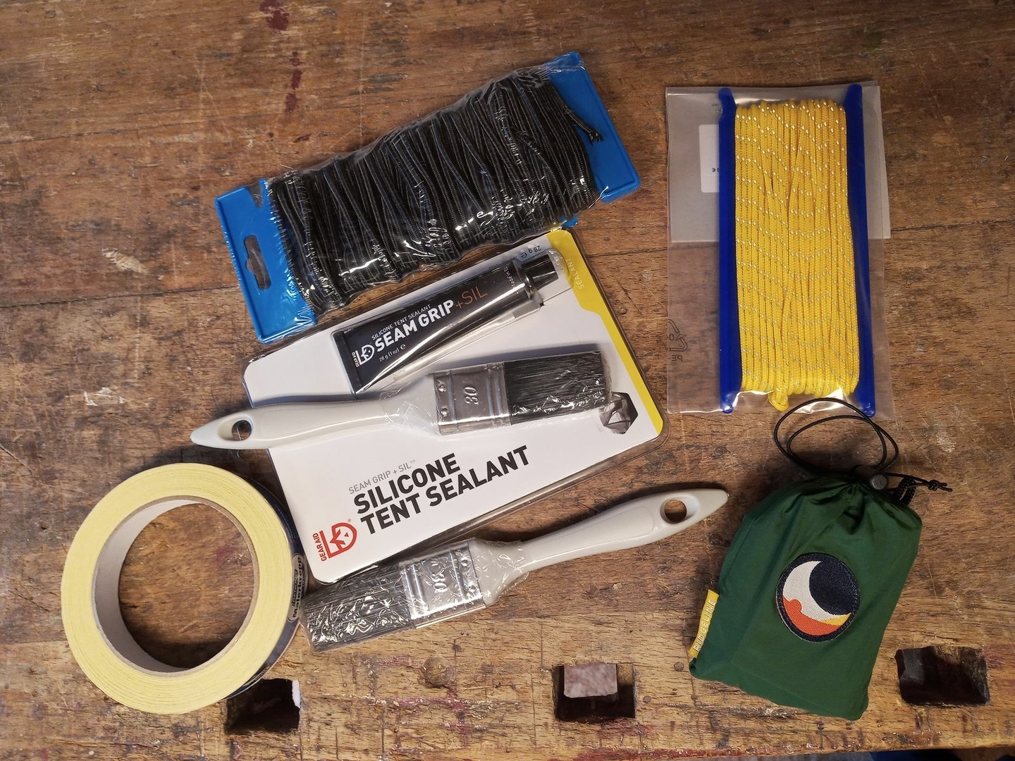 Silikon-Nahtversiegler für`s Tarp. 3mm Zeltleine in gelb, weil die Abspannleinen beim 12ft-Tarp von Onewind leider in dunkel geliefert werden (beim 11`er sind sie orange, was ich sinnvoll finde). 4mm Gummileine für alles, was zukünftig geshockcorded werden will.