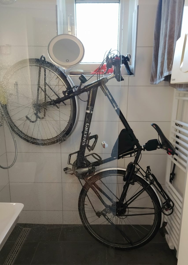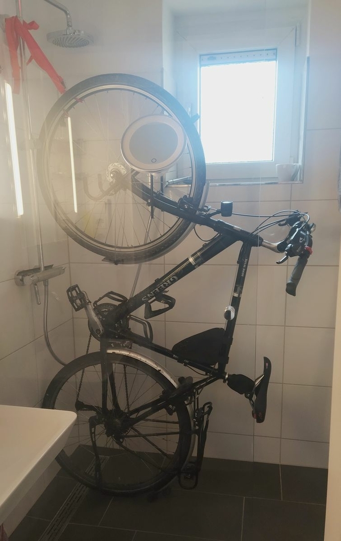 Es ist nur etwas mühsam, das Rad da reinzubugsieren, mit einem Duschvorhang wäre es einfacher. Muss ich auch nicht noch einmal haben ;)