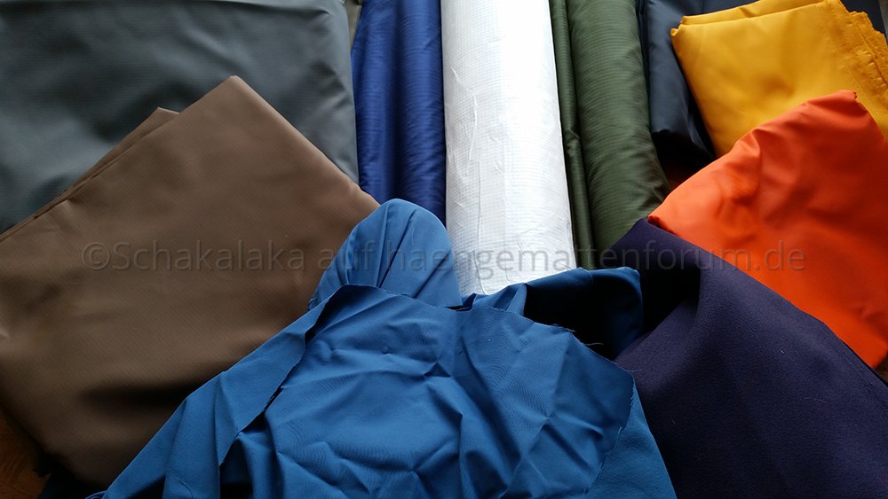 Ripstop-Nylon und Ripstop-Polyester. Wobei ich festes Nylon bevorzuge. Ich habe einen 2.6oz Nylon Ripstop-Stoff auf eBay geschossen, der (für mich) beste Liegeeigenschaften hat. Außerdem ist er 190cm breit... Ansonsten fühlen sich HyperD und Argon ziemlich gut an.