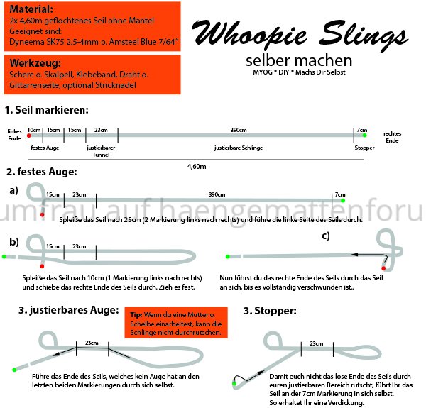 Das ist ein Name von whoopieslings.com für eine justierbare Seilschlaufe. Dieses Seil, wovon man zum Aufhängen der Hängematte zwei Stück benötigt. Ihr braucht also 2x4x60m nutzbares Seil. Die Seilschlaufe hat ein festes Auge am einen Ende und am anderen ein große justierbare Schlaufe. Dadurch, dass das Seil sich in sich selbst festzurrt, wird die Spannung im eingestellten Bereich gehalten.