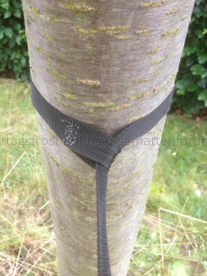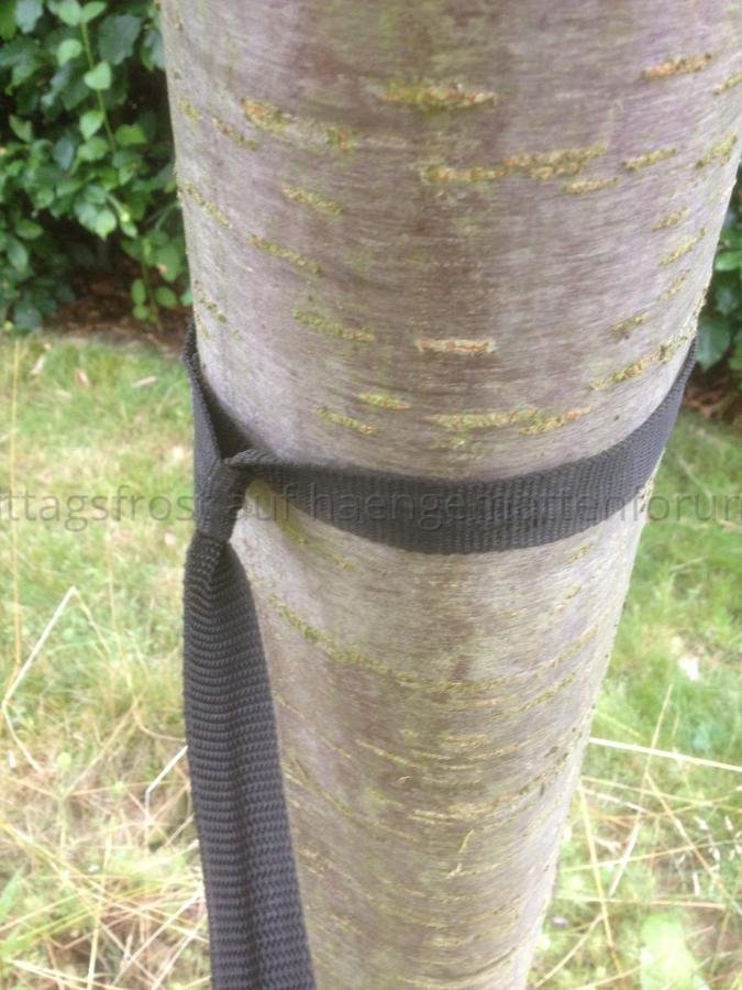 Der Baumgurt wird nicht so stark an den Baum gepresst wie in Variante 1, deshalb könnte er verrutschen. Durch den Zug der Hängematte am Baumgurt wird aber die Schlaufe in der Mitte des Stammes zentriert und die Lage der Schlaufe bleibt stabil.