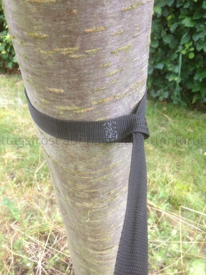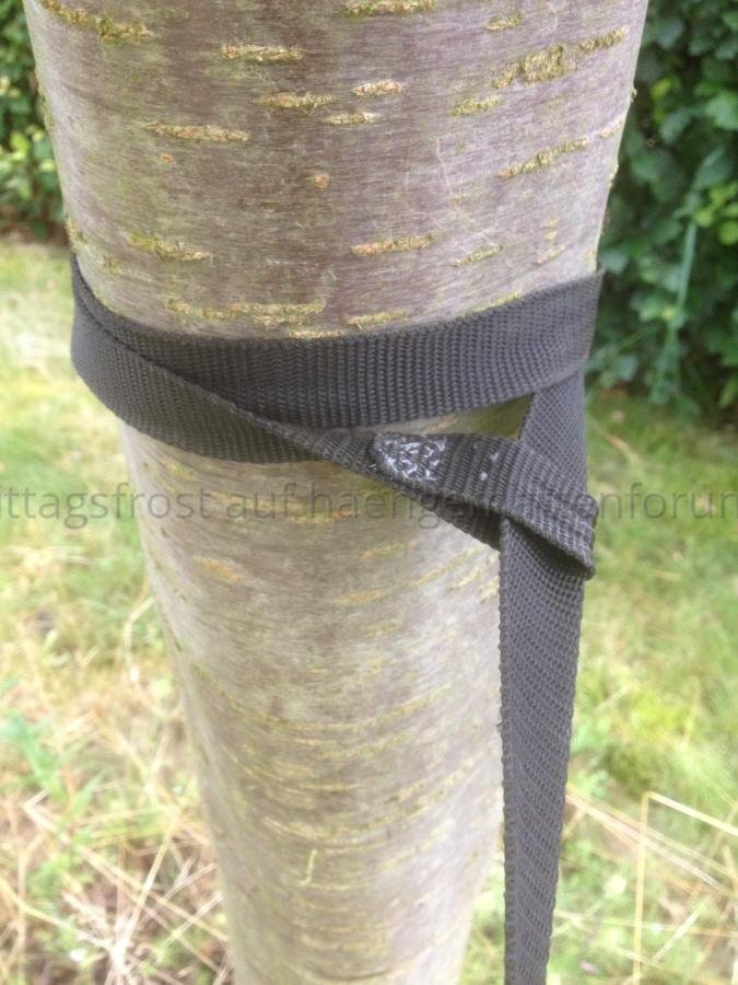 Schlaufenende einmal vollständig um den Baum wickeln und erst dann das andere Ende durchstecken. Durch die größere Kontaktfläche ergibt sich eine größere Reibung des Bandes am Baum und es verrutscht nicht mehr. Dadurch bleibt die Schlaufe da, wo sie sein soll und wandert nicht mehr in die Mitte.