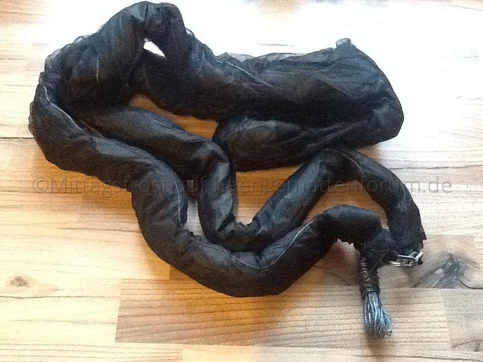 Die länglich schmalen Hülsen erinnern tatsächlich eine Schlangenhaut. Die Schlangenhäute (immer zwei Stück) werden über die zusammengerollte Hängematte gestülpt.