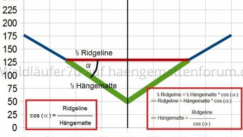 So weit so gut. Interessant ist, dass zwischen dem Hängewinkel und der Länge der Ridgeline im Verhältnis zur Länge der Hängematte ein Zusammenhang besteht.