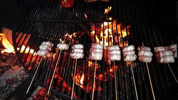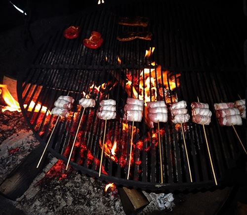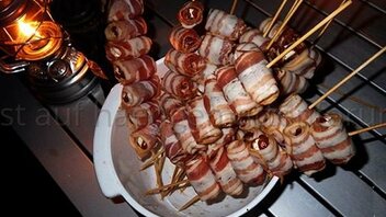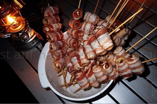 wenn Gewünscht mache ich dann zwischendurch mal diese mit Schafskäse gefüllten und mit Speck ummantelten Datteln am Spieß ...