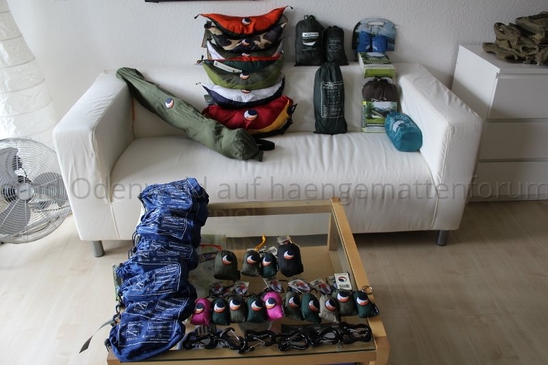 Ich habe den Vorteil, mich nicht auf Bilder im Internet verlassen zu müssen, sondern die Ware in der Hand halten und sofort mitnehmen zu können. Wo in Europa gibt es einen weiteren Ort, wo man eine derart breitgefächerte Palette von Hängematten bestaunen kann? Nirgends. Nur hier, beim Treffen.Dazu kommt, daß der Verkauf nur ganz dezent am Rande der Veranstaltung vollzogen wird und nicht einmal ansatzweise zum Hauptthema des Treffens wird. Also Leute, bringt Euer Hängemattenzeug mit und lasst uns fragen, anfassen, staunen, ausprobieren, vergleichen, beraten, fachsimpeln und ... vielleicht sogar ein bißchen verkaufen!