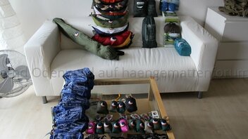 Darüber Einkaufstaschen aus Hängemattenstoff bzw. Mini Rucksäcke.Auf der Couch links quer ein Hängestuhl, dann unten meine eigene Mammock,